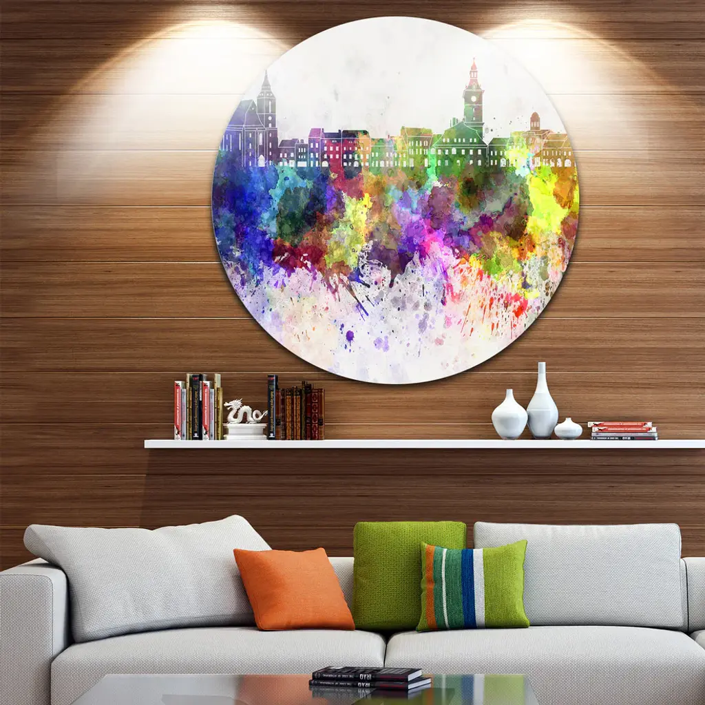 Bring Contemporary Abstraction to your home with this large Circle Metal wall art. This Brasov Skyline Metal Artwork makes it the focal point of any room or office. - White Gloss Coating ensures colors are extra vibrant with light reflection.- Aluminum grade Sheet Metal with 1 inch mounting frame on the back giving the illusion that the artwork is floating on the wall..- Mounting Brackets are included along with instructions.- High Quality Digital images are created directly into a glossy aluminum panel producing a stunning and captivating print into the glossy finish of the metal.- Water, Fire and Scratch resistant HD Aluminum panels.- Looks better than any photo paper and guaranteed to last at least 20 years- Easy to clean with a microfiber cloth. Colors are far superior to regular Canvas Art. - Easy to Hang