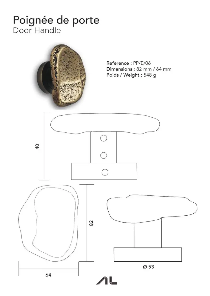 Use: Indoor or protected outdoorThis brass door handle is part of the Earth Prints collection, a range inspired by the richness and diversity of natural patterns. Crafted from cast brass, it stands out for its durability and longevity while reflecting exceptional artisanal craftsmanship.The unique motifs in this collection capture the essence of nature, with an organic style expressed through delicate textures and refined details. Each handle is handcrafted and meticulously finished, ensuring impeccable quality and a singular character in every piece.Designed to combine aesthetics and robustness, this handle retains its elegance over time, even with daily use. Its presence adds a subtle touch of organic charm, harmonizing effortlessly with various decorative environments.The Earth Prints collection elevates door handles into true design elements, enhancing spaces while reflecting a taste for noble materials and unique objects.note: Differences from the sample/photo provided should not be considered manufacturing defects, but rather a characteristic of the manual process, which may result in variations in color and uniformity.When placed outdoors, finishes may undergo color changes, which should not be considered a defect. Brass is a living material that gradually develops a patina over the years.