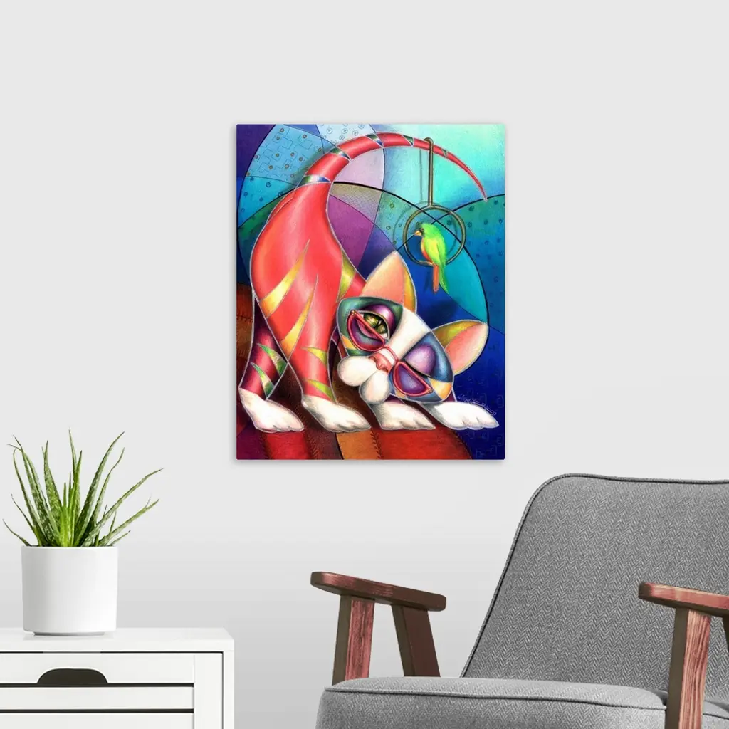 Contemporary artwork in the style of cubism of a cat with a bird in bold colors.