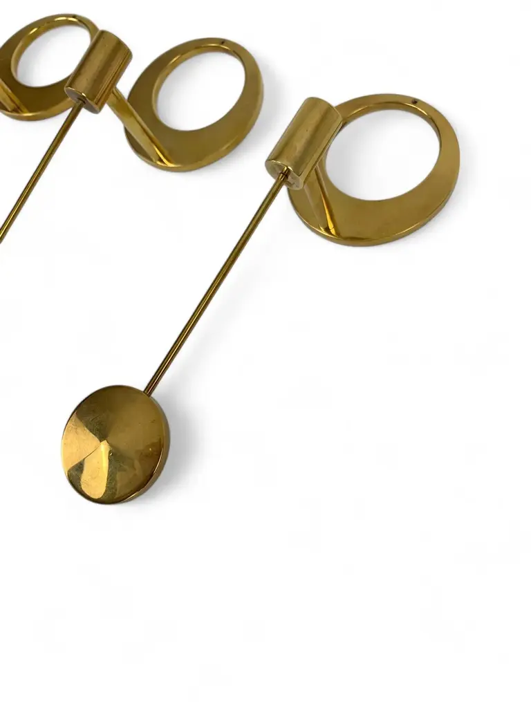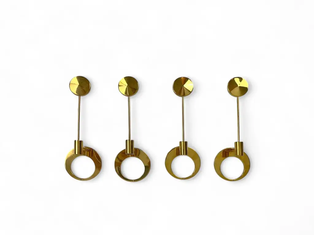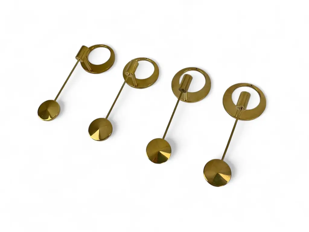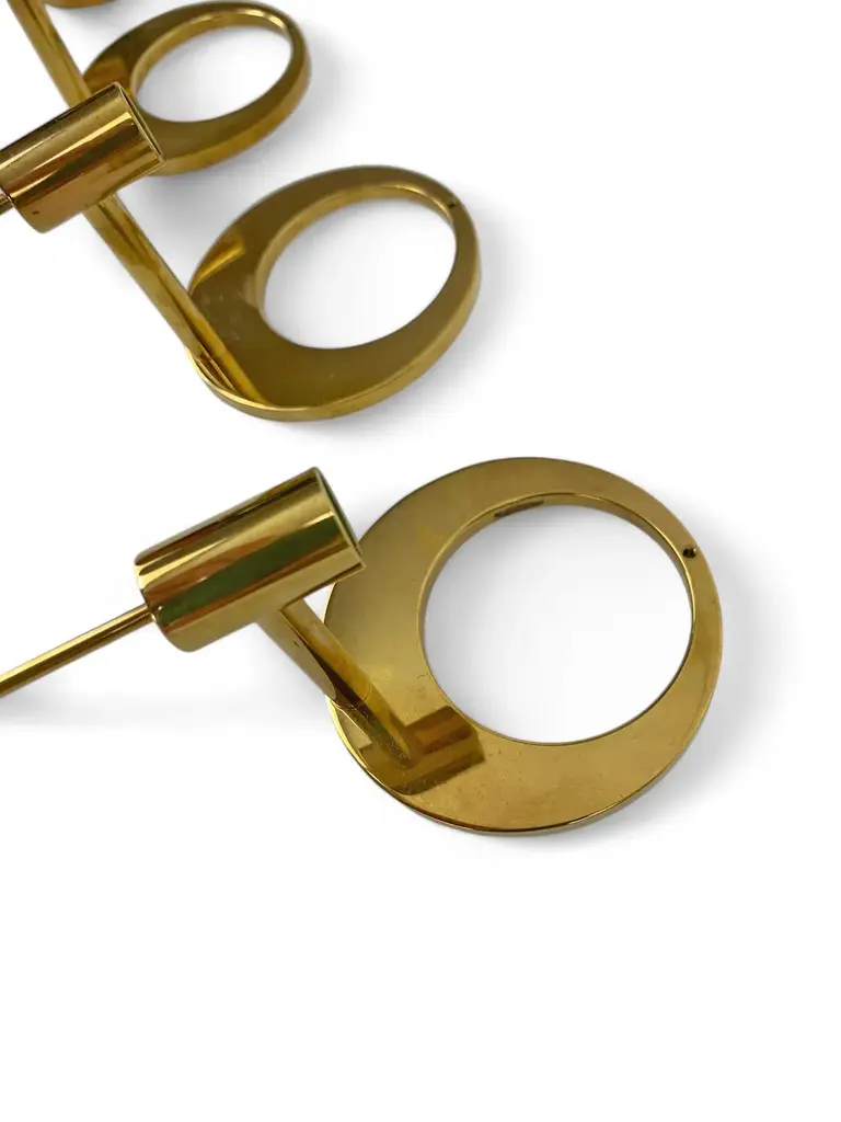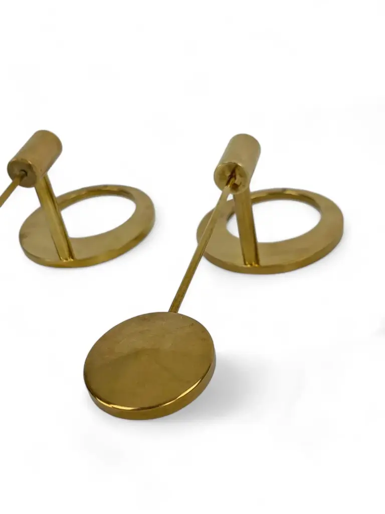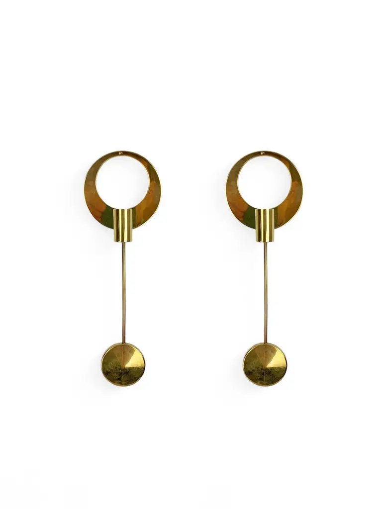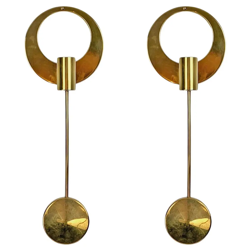 A set of 2 Modernist candle-holders in solid brass, made in the 1960-70s. Circular wall base, the socket fixed in a pendulum. To be used with so-called "Nordic" candles of +/- 12mm diameter, or just as a wall decoration. Signed on the back. Very nice condition with beautiful patina. This piece has an attribution mark, I am sure that it is completely authentic and take full responsibility for any authenticity issues arising from misattribution