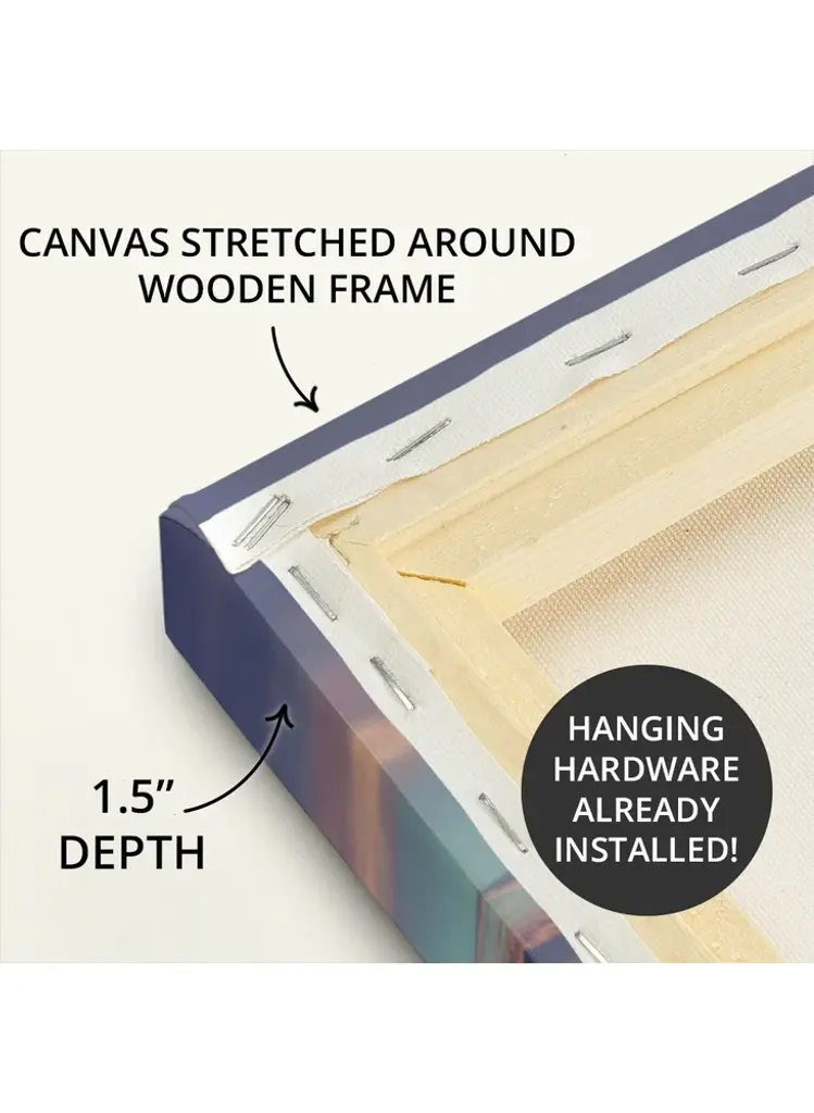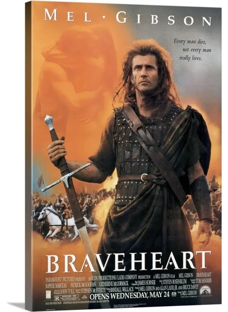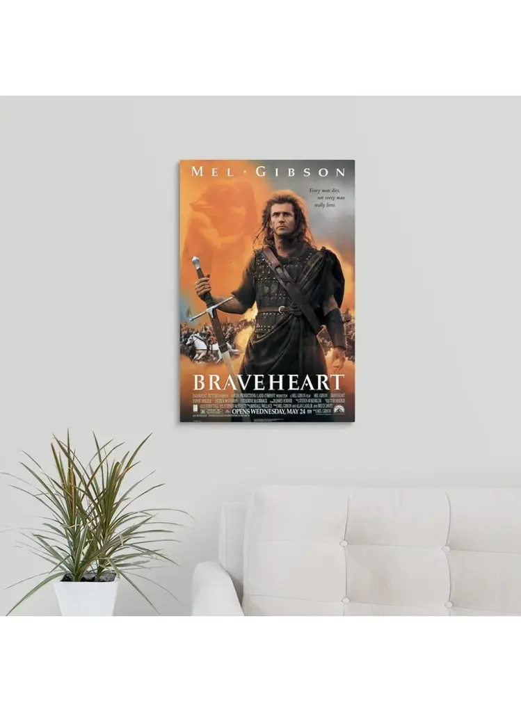 Gallery-Wrapped Canvas entitled 'Braveheart (1995)'. Big, vertical movie advertisement on a wall hanging for Braveheart, Mel Gibson stands as a warrior in front of a battle scene, a couple embracing in the top portion of the image. Text of movie description and credits at the top and bottom of the image. Multiple sizes available. Primary colors within this image include: Peach, Black, Gray, White. Made in the USA. Satisfaction guaranteed. Archival-quality UV-resistant inks. Canvas frames are built with farmed or reclaimed domestic (pine or poplar) wood. Canvas is designed to prevent fading.