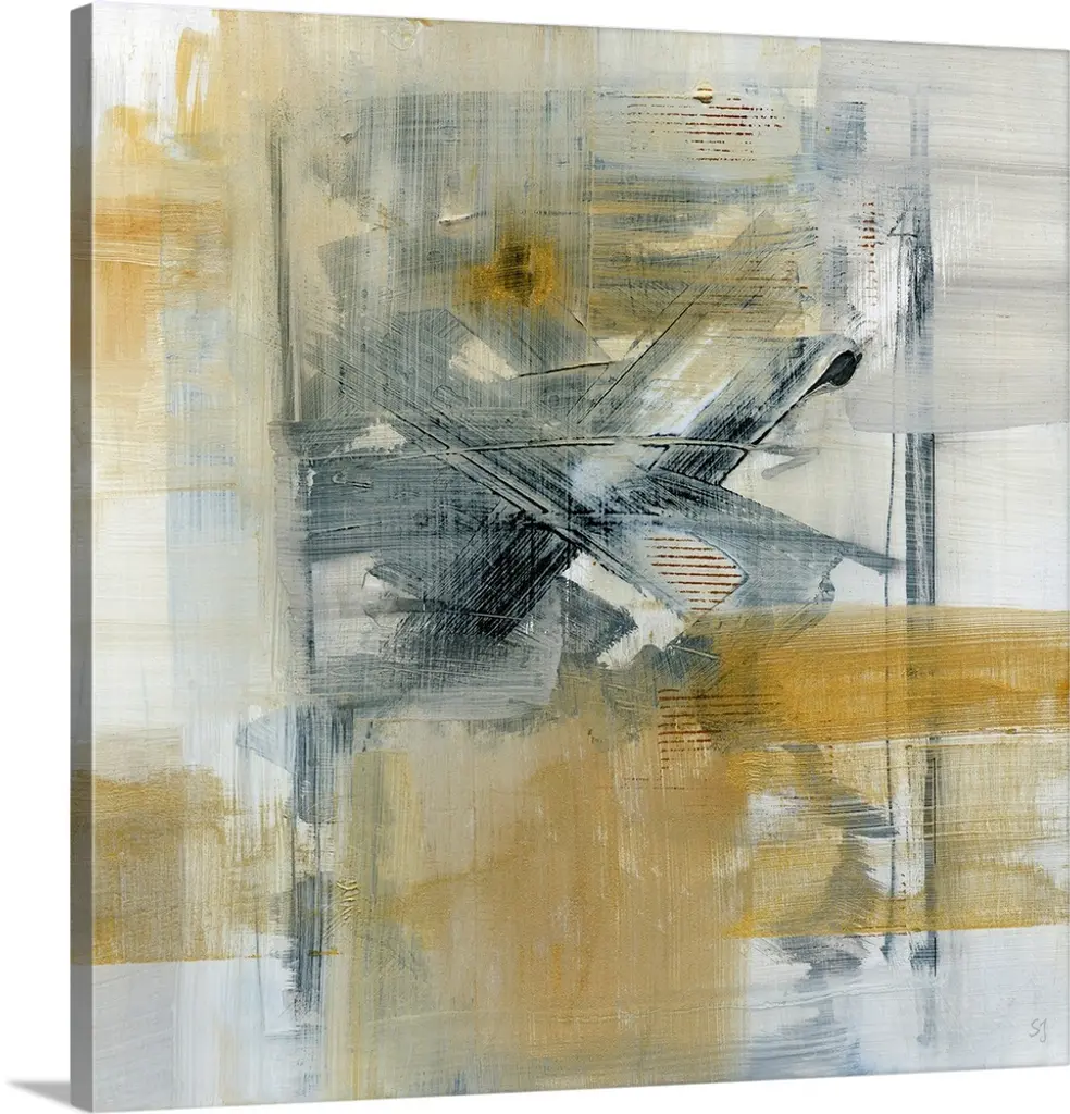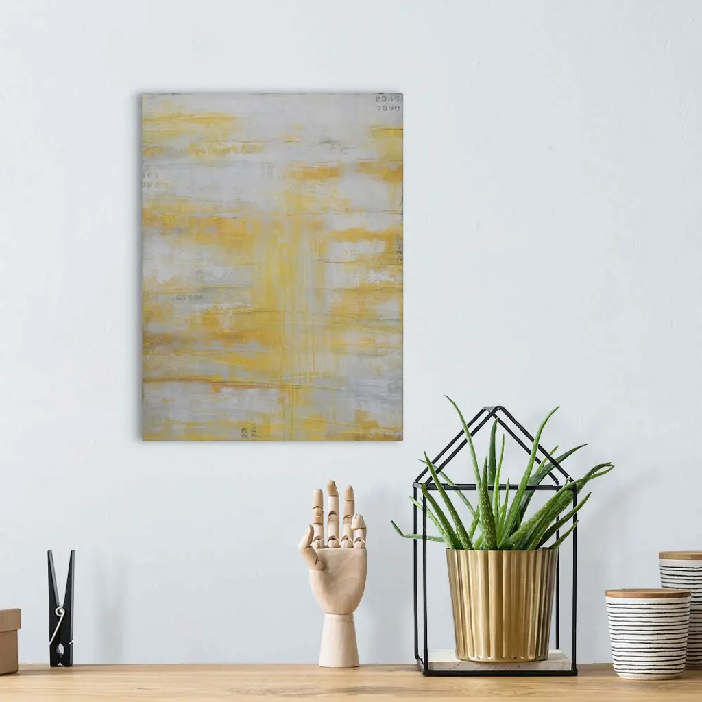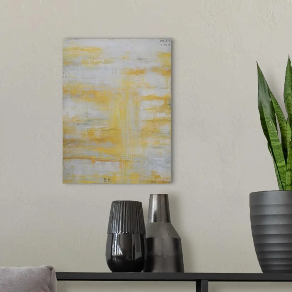 Abstract artwork with a silver background and gold dusted across it and dripping down.