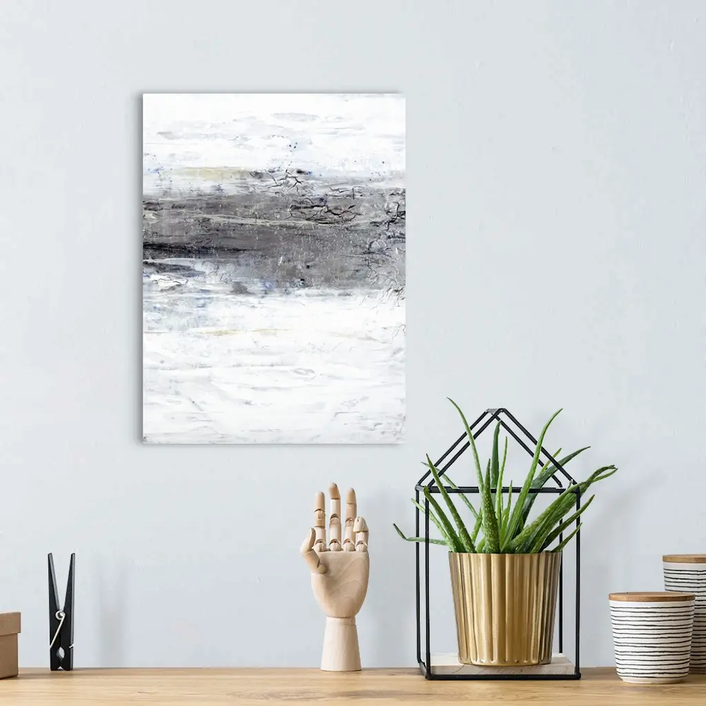Abstract painting of textured brush strokes with a silver horizontal line in the center.