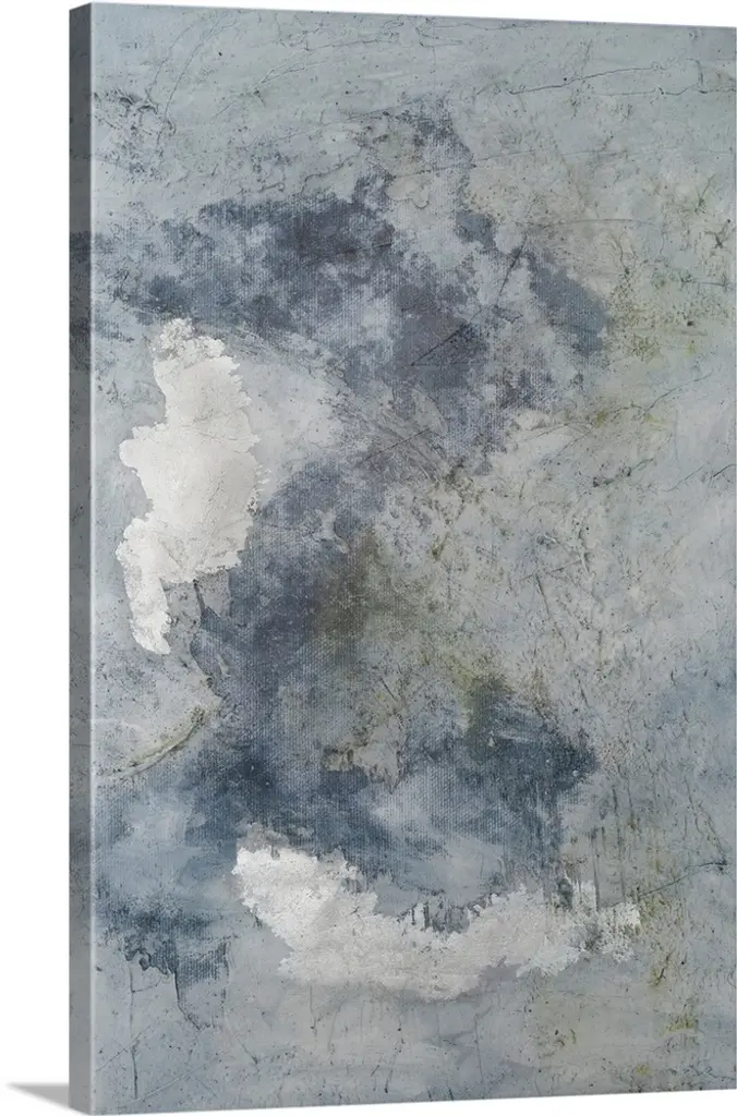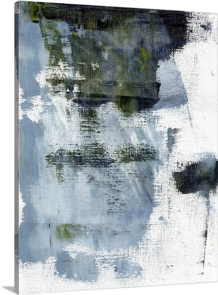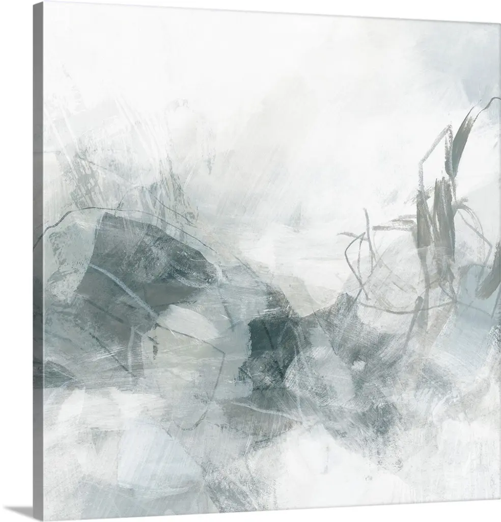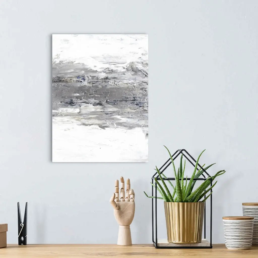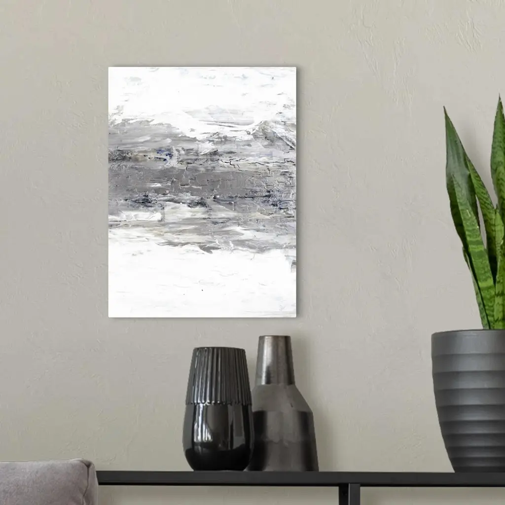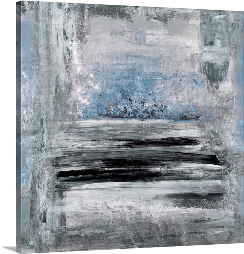 Abstract painting of textured brush strokes with a silver horizontal line in the center.