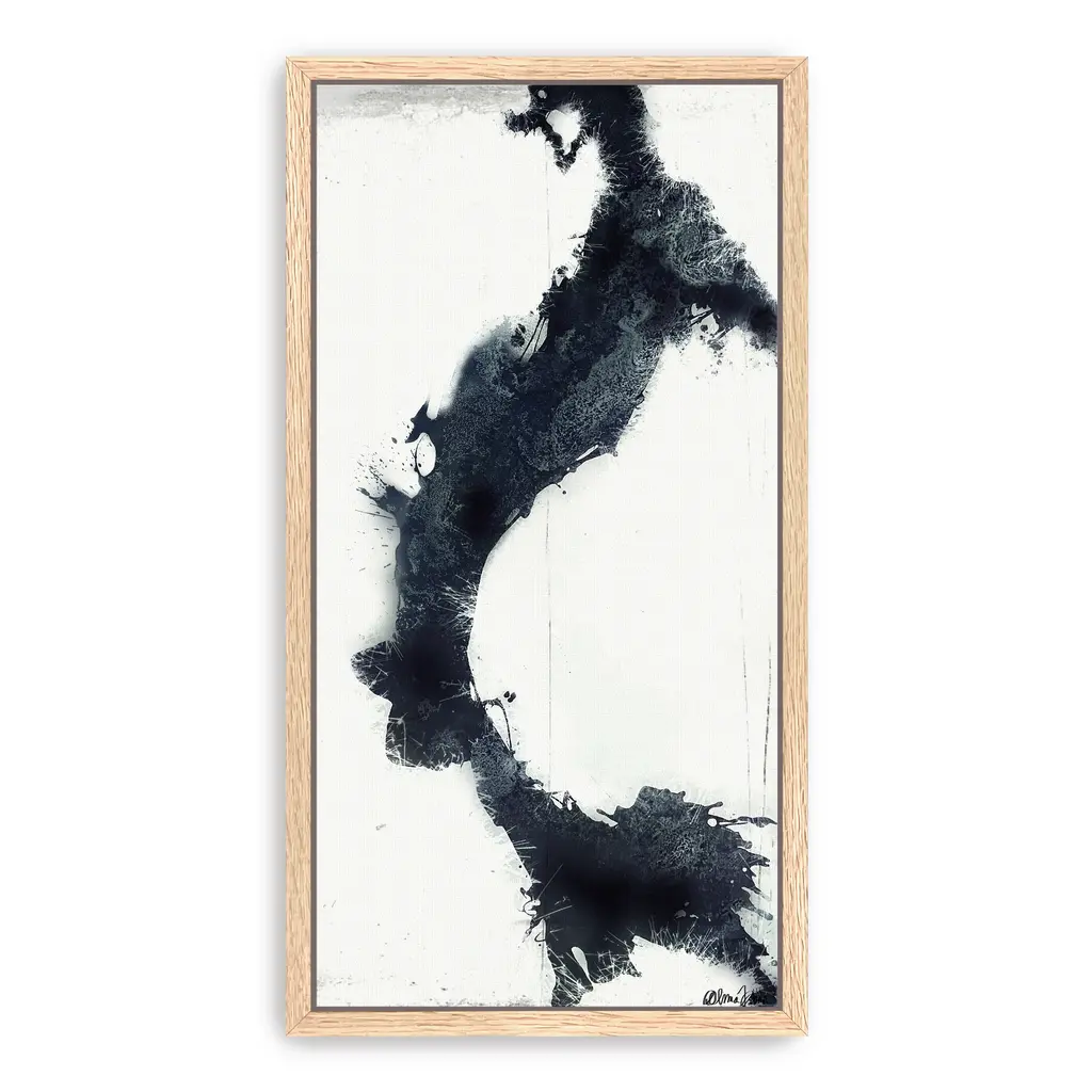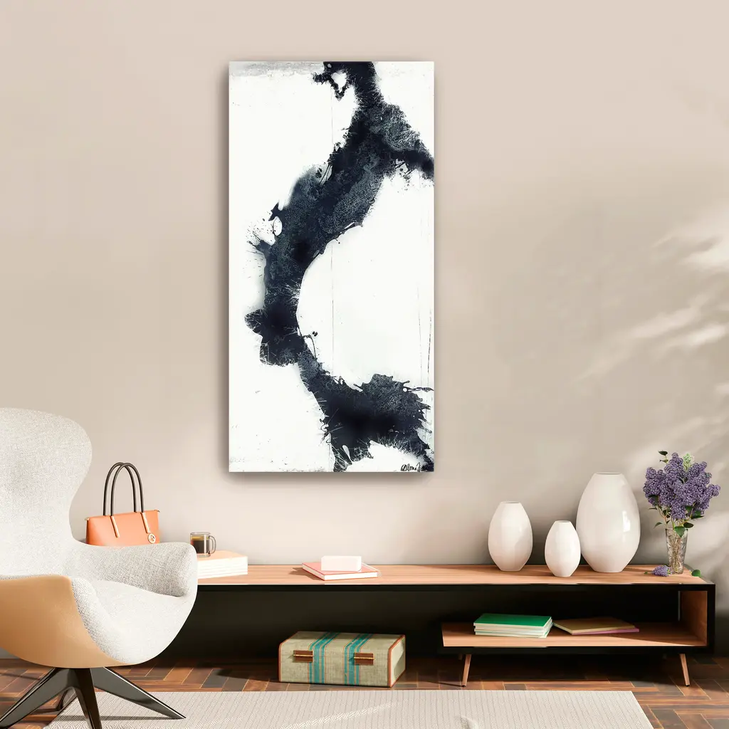 A bold, flowing black ink shape twists gracefully against a crisp white background, creating a striking interplay of contrast and movement. This minimalist abstract evokes both mystery and elegance, perfect for modern and contemporary spaces. Our Gallery Wrap Canvas Prints are proudly assembled with high quality materials in California, USA. Each piece is printed on a thick, archival grade canvas using Giclee technology. It is then hand-stretched by our experienced artisans over solid wood bars, which will not warp over time. The final product is a piece personally crafted for you to confidently display on your wall. Care and Assembly: Ensure that the location of your piece has little to no exposure to heat, sunlight, and moisture. Wipe clean, only if needed. Each piece includes hanging hardware to hang on your wall vertically.