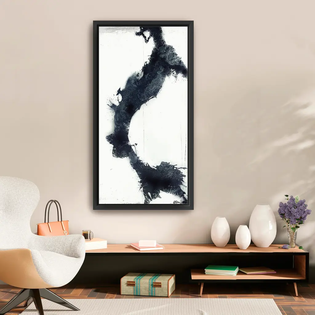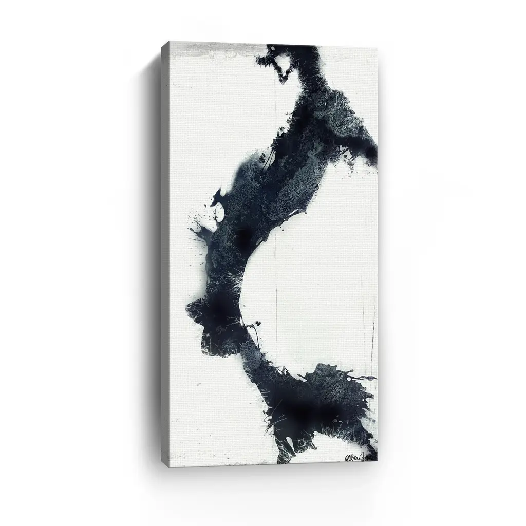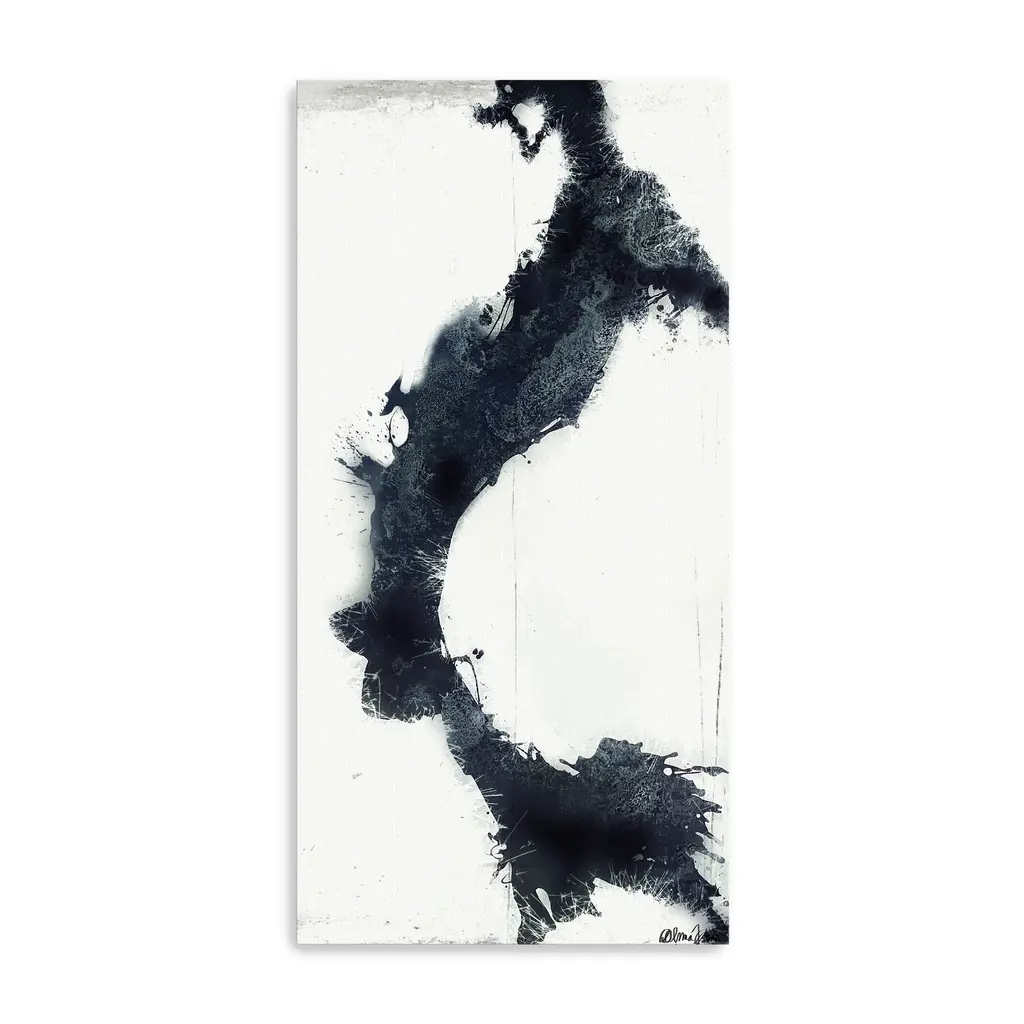 A bold, flowing black ink shape twists gracefully against a crisp white background, creating a striking interplay of contrast and movement. This minimalist abstract evokes both mystery and elegance, perfect for modern and contemporary spaces. Our Gallery Wrap Canvas Prints are proudly assembled with high quality materials in California, USA. Each piece is printed on a thick, archival grade canvas using Giclee technology. It is then hand-stretched by our experienced artisans over solid wood bars, which will not warp over time. The final product is a piece personally crafted for you to confidently display on your wall. Care and Assembly: Ensure that the location of your piece has little to no exposure to heat, sunlight, and moisture. Wipe clean, only if needed. Each piece includes hanging hardware to hang on your wall vertically.