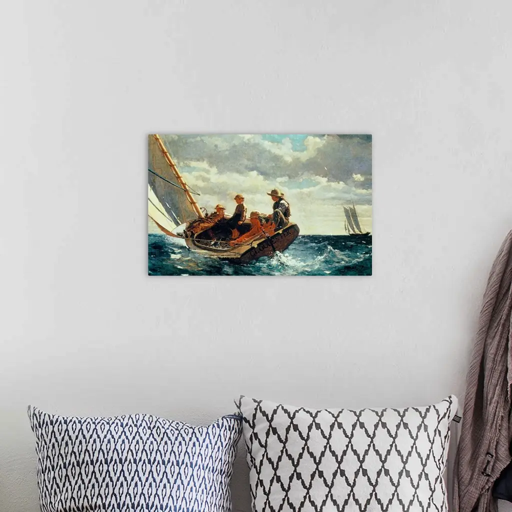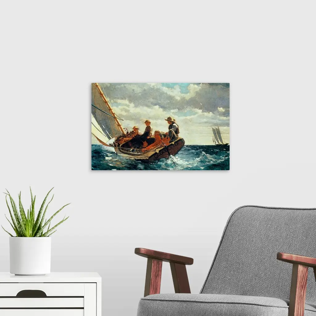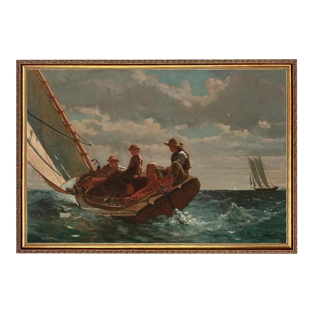 Horizontal, large classic art painting of four people on a sailboat that is nearly tipping into rough waters, beneath a grey, stormy looking sky.