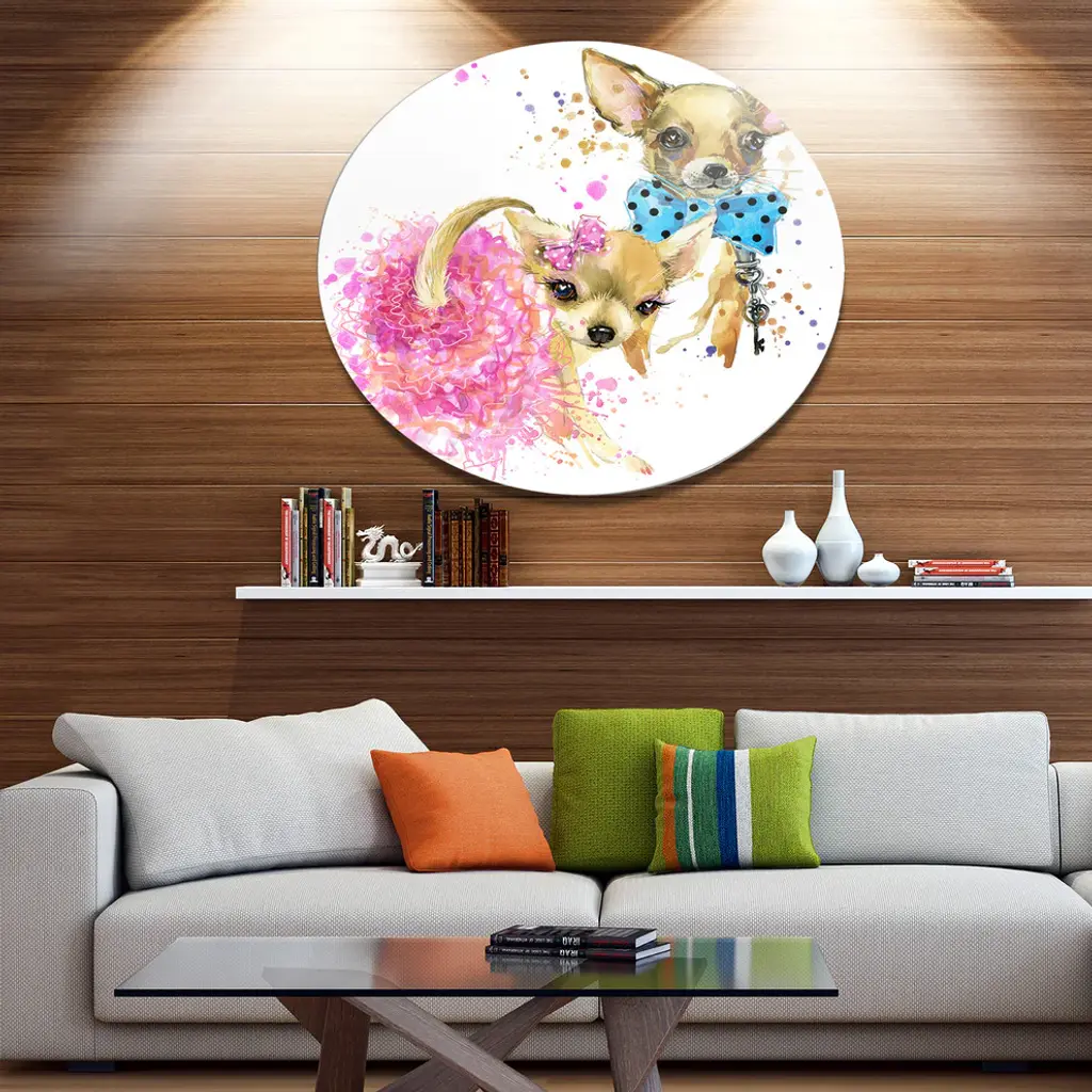 Bring Contemporary Abstraction to your home with this large Circle Metal wall art. This Bridge and Groom Dog Illustration Metal Artwork makes it the focal point of any room or office. - White Gloss Coating ensures colors are extra vibrant with light reflection.- Aluminum grade Sheet Metal with 1 inch mounting frame on the back giving the illusion that the artwork is floating on the wall..- Mounting Brackets are included along with instructions.- High Quality Digital images are created directly into a glossy aluminum panel producing a stunning and captivating print into the glossy finish of the metal.- Water, Fire and Scratch resistant HD Aluminum panels.- Looks better than any photo paper and guaranteed to last at least 20 years- Easy to clean with a microfiber cloth. Colors are far superior to regular Canvas Art. - Easy to Hang