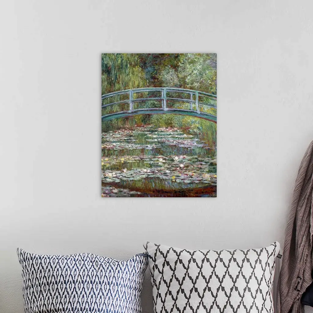 In 1893, Monet, a passionate horticulturist, purchased land with a pond near his property in Giverny, intending to build something for the pleasure of the eye and also for motifs to paint. The result was his water-lily garden. In 1899, he began a series of eighteen views of the wooden footbridge over the pond, completing twelve paintings, including the present one, that summer. The vertical format of the picture, unusual in this series, gives prominence to the water lilies and their reflections on the pond.