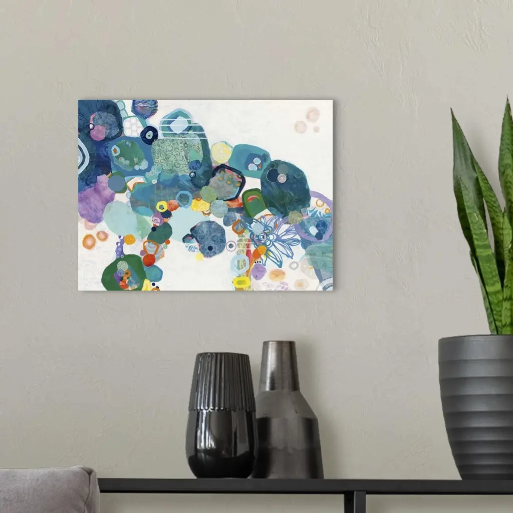 Contemporary abstract painting using wild shapes and vibrant colors.
