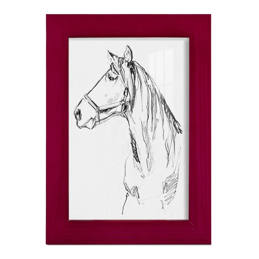 Bridle Portraits I -EZ SWITCH Framed Print w/glass-Cherry Red A delightful, framed print. Featuring a solid wood frame with real wood glass. This premium print is giclee quality. In addition, every frame features a removable back and table top stand. This allows you to change your art in the future or to just stand the art on a table for a new look. We are sure you'll enjoy our new series of EZ SWITCH Framed Art. Solid Wood Frame Real Glass Removable / Replaceable Art Built in Tabletop Stand Sizes range from 4x6 up to 12x15 - buy just one or pair them up as sets as you see fit.