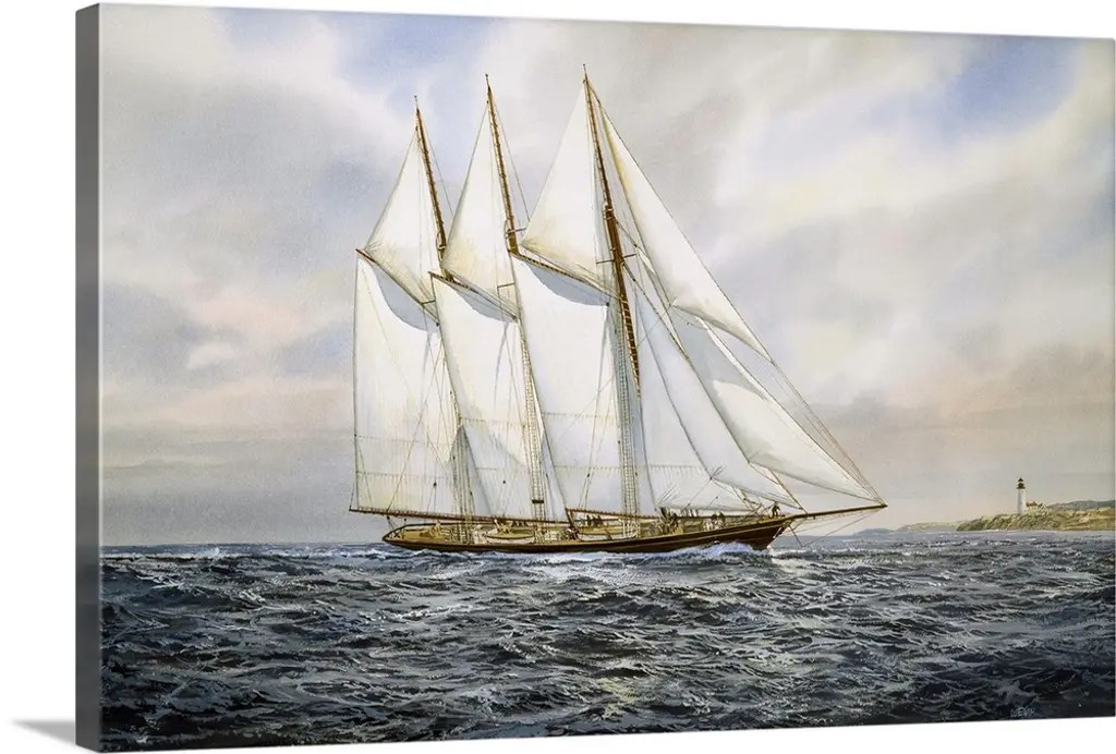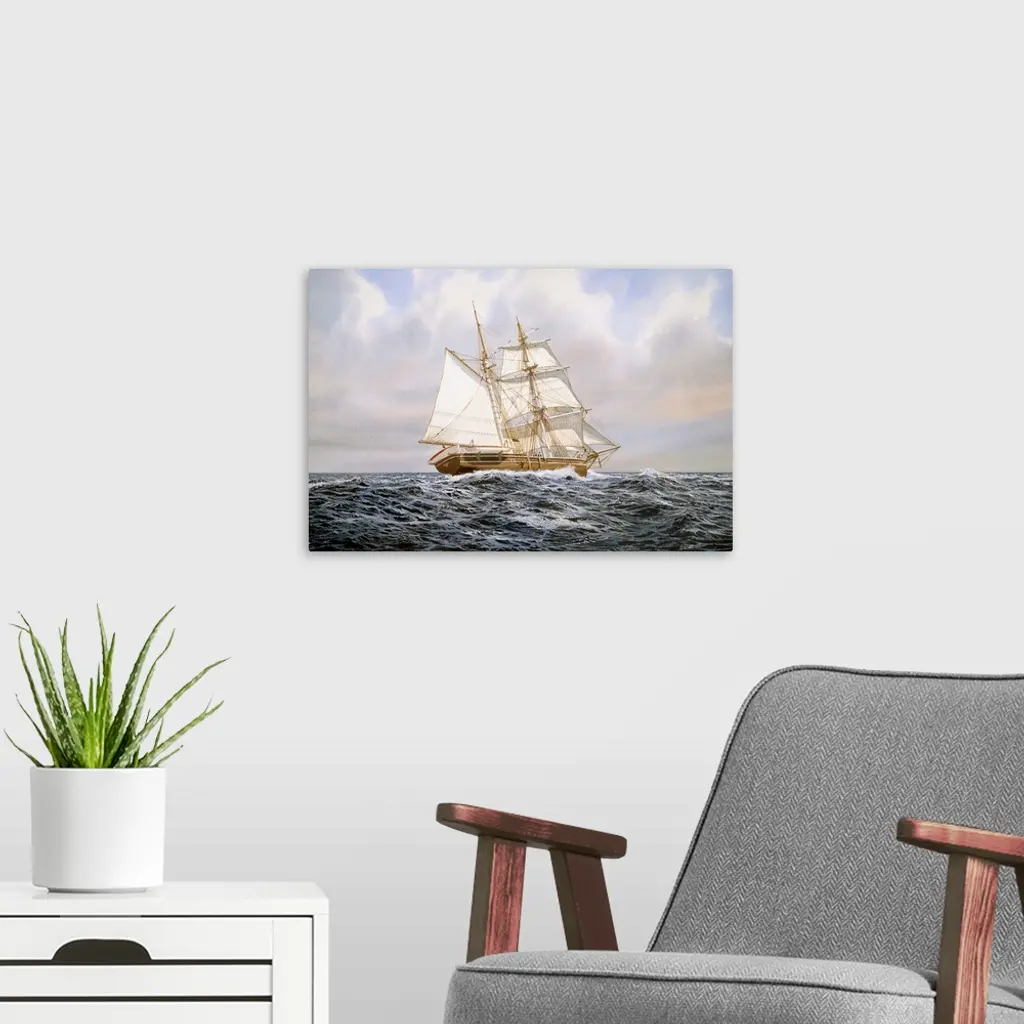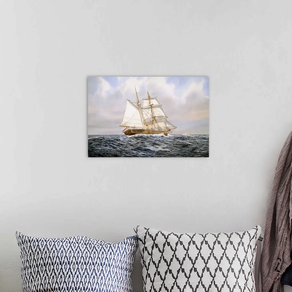 Contemporary painting of an idyllic scene of a ship sailing the open waters.