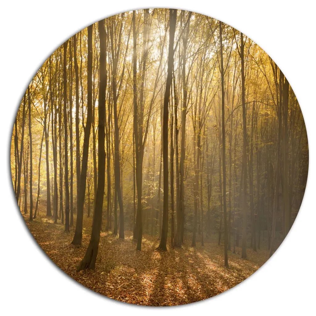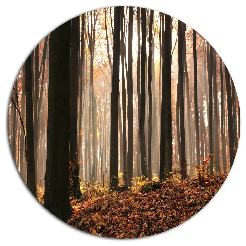 Bring Contemporary Abstraction to your home with this large Circle Metal wall art. This Bright Autumn Day in Thick Forest Metal Artwork makes it the focal point of any room or office. - White Gloss Coating ensures colors are extra vibrant with light reflection.- Aluminum grade Sheet Metal with 1 inch mounting frame on the back giving the illusion that the artwork is floating on the wall..- Mounting Brackets are included along with instructions.- High Quality Digital images are created directly into a glossy aluminum panel producing a stunning and captivating print into the glossy finish of the metal.- Water, Fire and Scratch resistant HD Aluminum panels.- Looks better than any photo paper and guaranteed to last at least 20 years- Easy to clean with a microfiber cloth. Colors are far superior to regular Canvas Art. - Easy to Hang