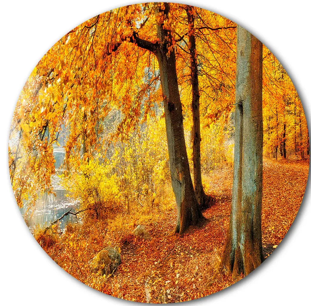 Bring Contemporary Abstraction to your home with this large Circle Metal wall art. This Bright Autumn Forest Panorama Metal Artwork makes it the focal point of any room or office. - White Gloss Coating ensures colors are extra vibrant with light reflection.- Aluminum grade Sheet Metal with 1 inch mounting frame on the back giving the illusion that the artwork is floating on the wall..- Mounting Brackets are included along with instructions.- High Quality Digital images are created directly into a glossy aluminum panel producing a stunning and captivating print into the glossy finish of the metal.- Water, Fire and Scratch resistant HD Aluminum panels.- Looks better than any photo paper and guaranteed to last at least 20 years- Easy to clean with a microfiber cloth. Colors are far superior to regular Canvas Art. - Easy to Hang