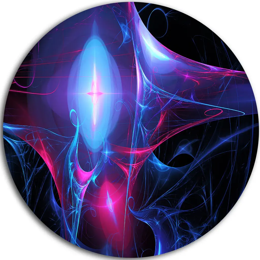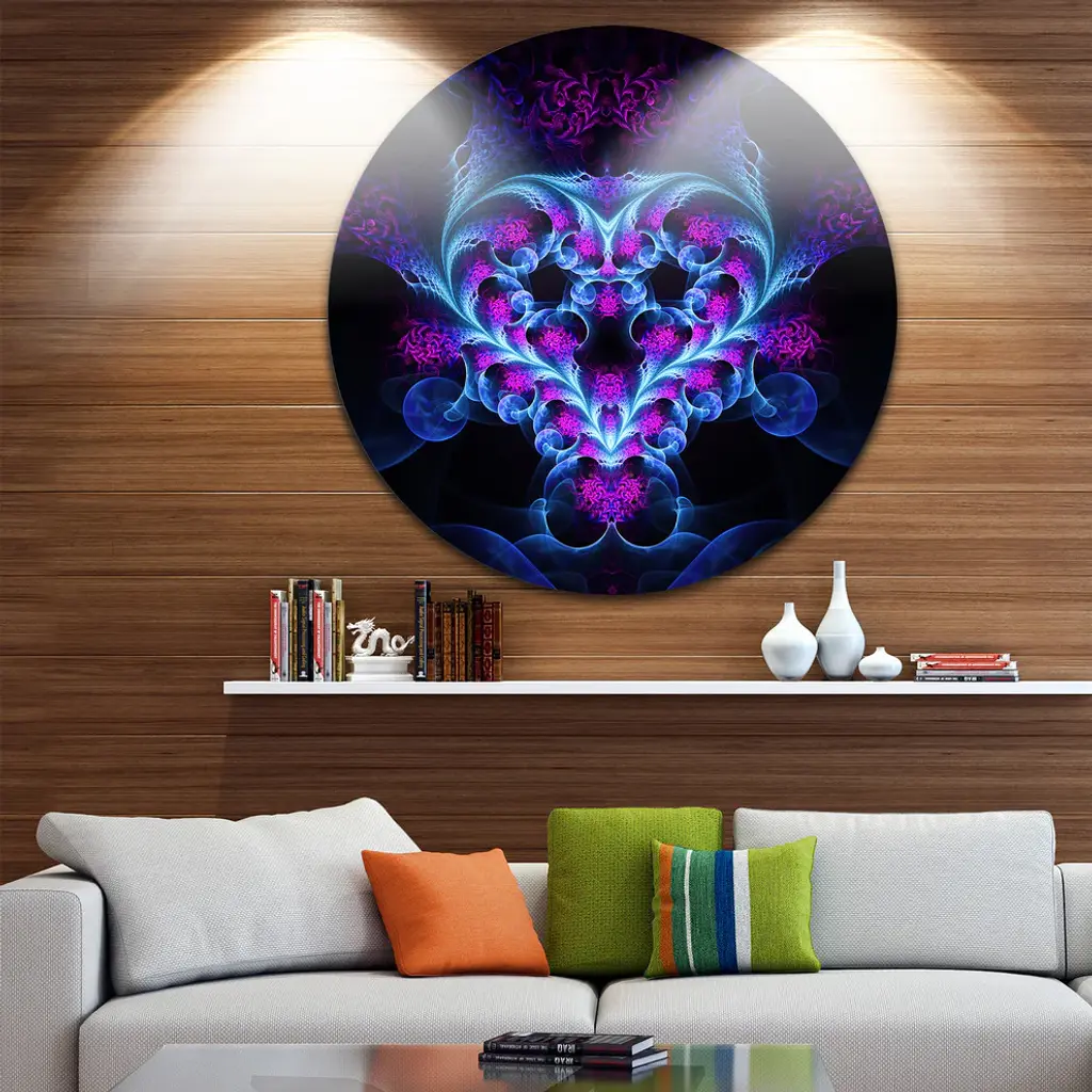 Bring Contemporary Abstraction to your home with this large Circle Metal wall art. This Bright Blue Large Fractal Flower Design Metal Artwork makes it the focal point of any room or office. - White Gloss Coating ensures colors are extra vibrant with light reflection.- Aluminum grade Sheet Metal with 1 inch mounting frame on the back giving the illusion that the artwork is floating on the wall..- Mounting Brackets are included along with instructions.- High Quality Digital images are created directly into a glossy aluminum panel producing a stunning and captivating print into the glossy finish of the metal.- Water, Fire and Scratch resistant HD Aluminum panels.- Looks better than any photo paper and guaranteed to last at least 20 years- Easy to clean with a microfiber cloth. Colors are far superior to regular Canvas Art. - Easy to Hang