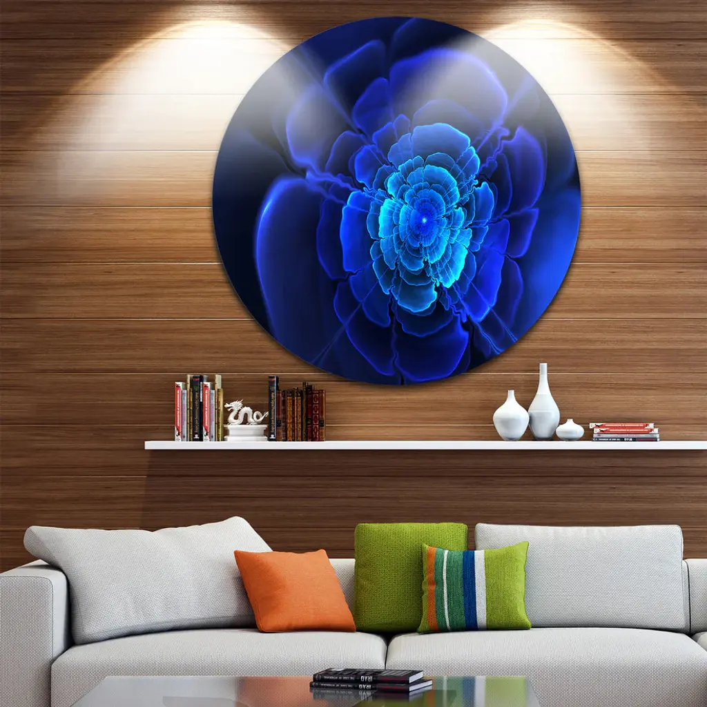 Bring Contemporary Abstraction to your home with this large Circle Metal wall art. This Bright Blue Fractal Flower in Dark Metal Artwork makes it the focal point of any room or office. - White Gloss Coating ensures colors are extra vibrant with light reflection.- Aluminum grade Sheet Metal with 1 inch mounting frame on the back giving the illusion that the artwork is floating on the wall..- Mounting Brackets are included along with instructions.- High Quality Digital images are created directly into a glossy aluminum panel producing a stunning and captivating print into the glossy finish of the metal.- Water, Fire and Scratch resistant HD Aluminum panels.- Looks better than any photo paper and guaranteed to last at least 20 years- Easy to clean with a microfiber cloth. Colors are far superior to regular Canvas Art. - Easy to Hang