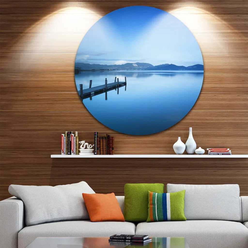 Bring Contemporary Abstraction to your home with this large Circle Metal wall art. This Bright Blue Sky with Pier Metal Artwork makes it the focal point of any room or office. - White Gloss Coating ensures colors are extra vibrant with light reflection.- Aluminum grade Sheet Metal with 1 inch mounting frame on the back giving the illusion that the artwork is floating on the wall..- Mounting Brackets are included along with instructions.- High Quality Digital images are created directly into a glossy aluminum panel producing a stunning and captivating print into the glossy finish of the metal.- Water, Fire and Scratch resistant HD Aluminum panels.- Looks better than any photo paper and guaranteed to last at least 20 years- Easy to clean with a microfiber cloth. Colors are far superior to regular Canvas Art. - Easy to Hang