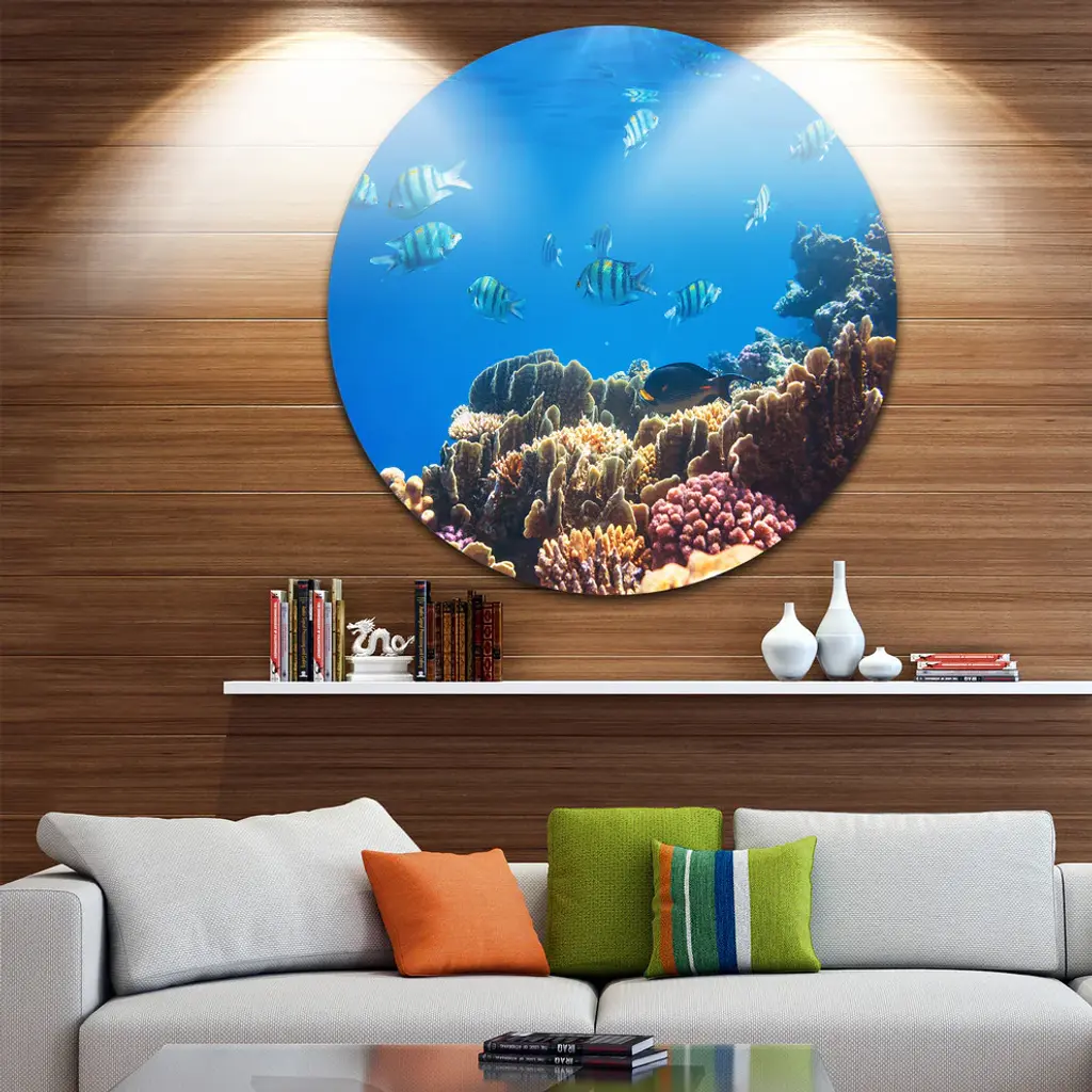 Bright Blue Waters And Coral Fish, Seashore Round Metal Wall Art, 23"