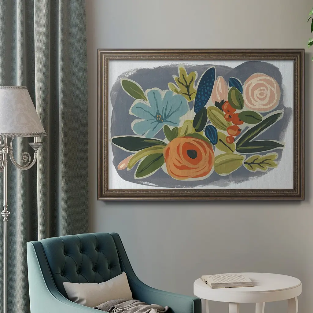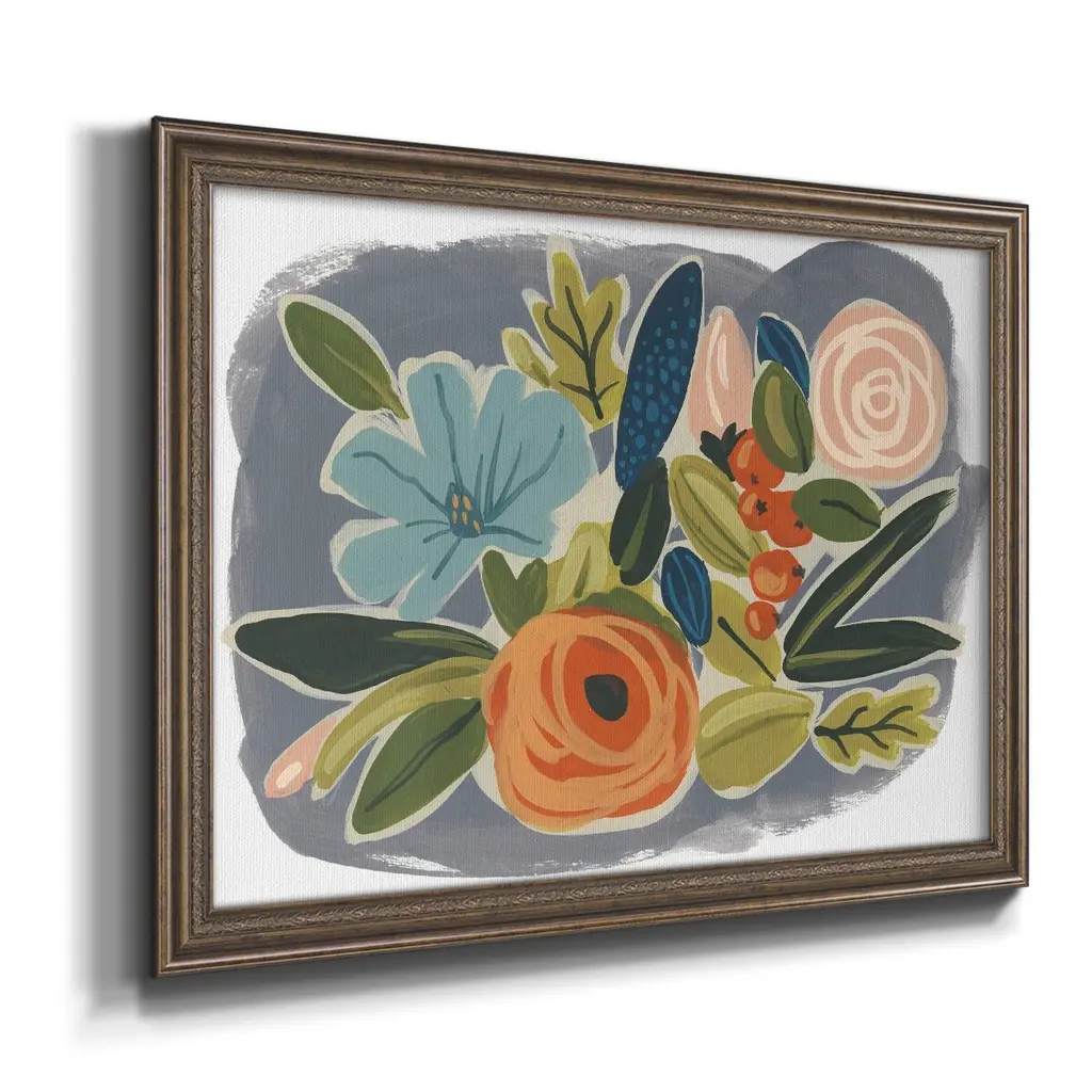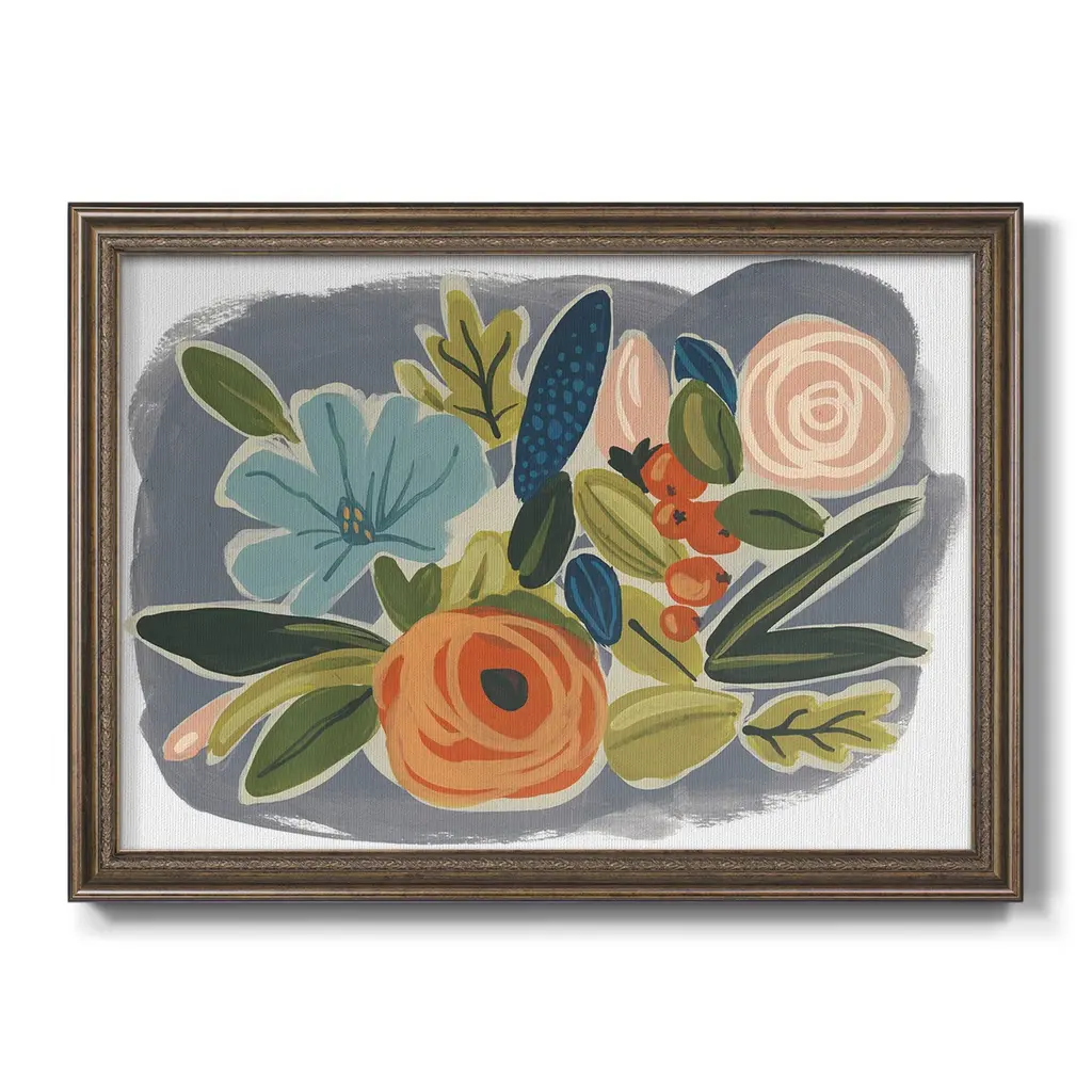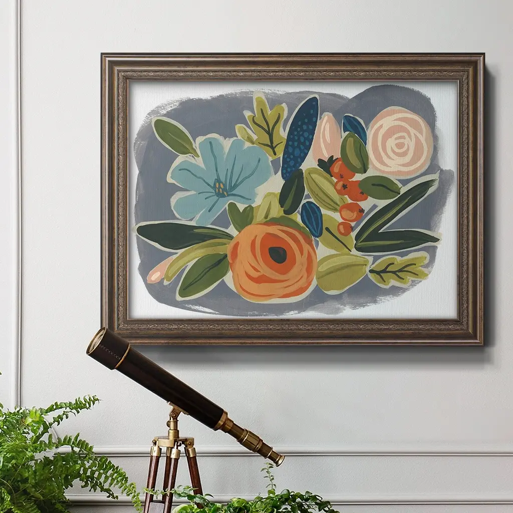 Bright Botany I Premium Framed Canvas- Ready to Hang A Premium Framed Canvas created to last. Framed in distressed wood and available in an array of sizes and colors Featuring a beveled a solid wood stretcher bar, each piece comes ready to hand 3 SIZES AVAILABLE 16''X20'' - Overall Size 18'X27'' - Overall Size 24''x36'' - Overall Size Each piece is made to order. Each piece comes with hanging hardware. Made in the USA Ready to Hang Giclee Paper Print Acrylic Glass Beveled Matt Board