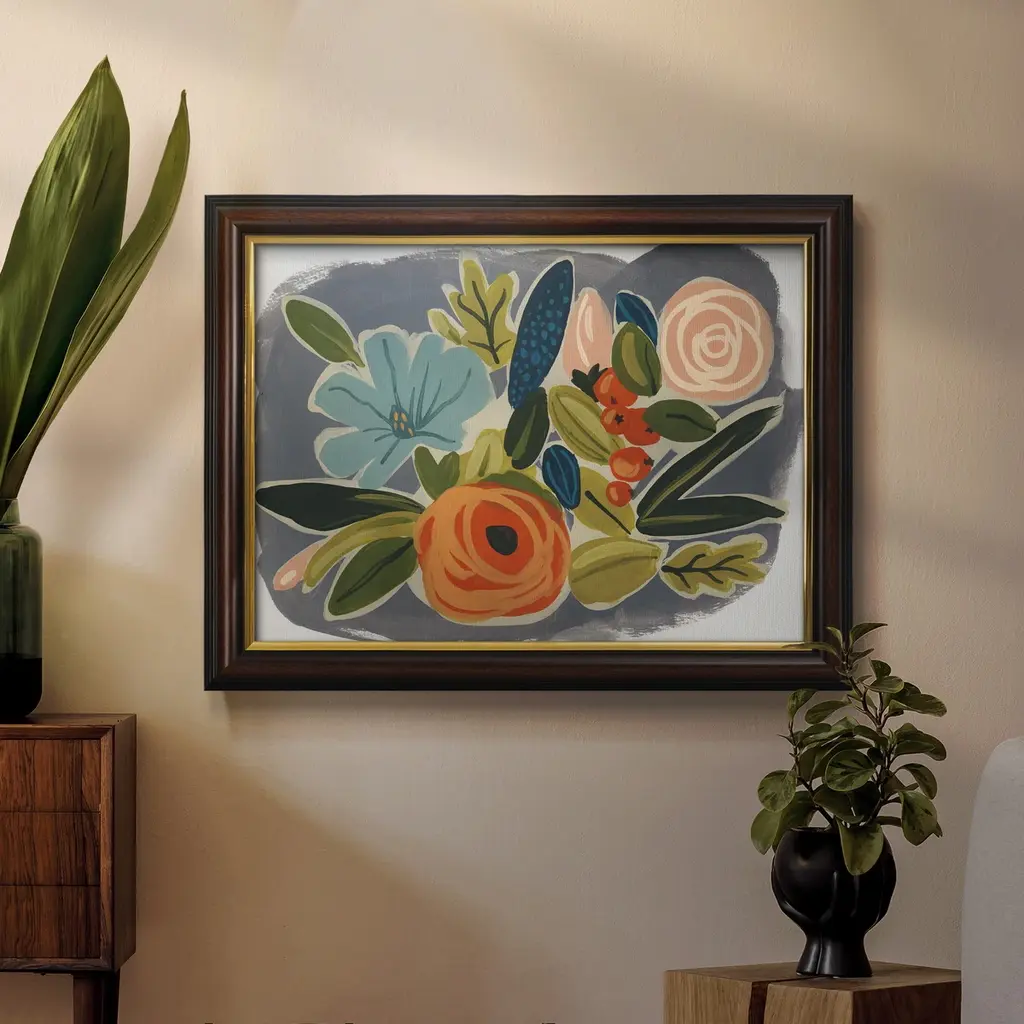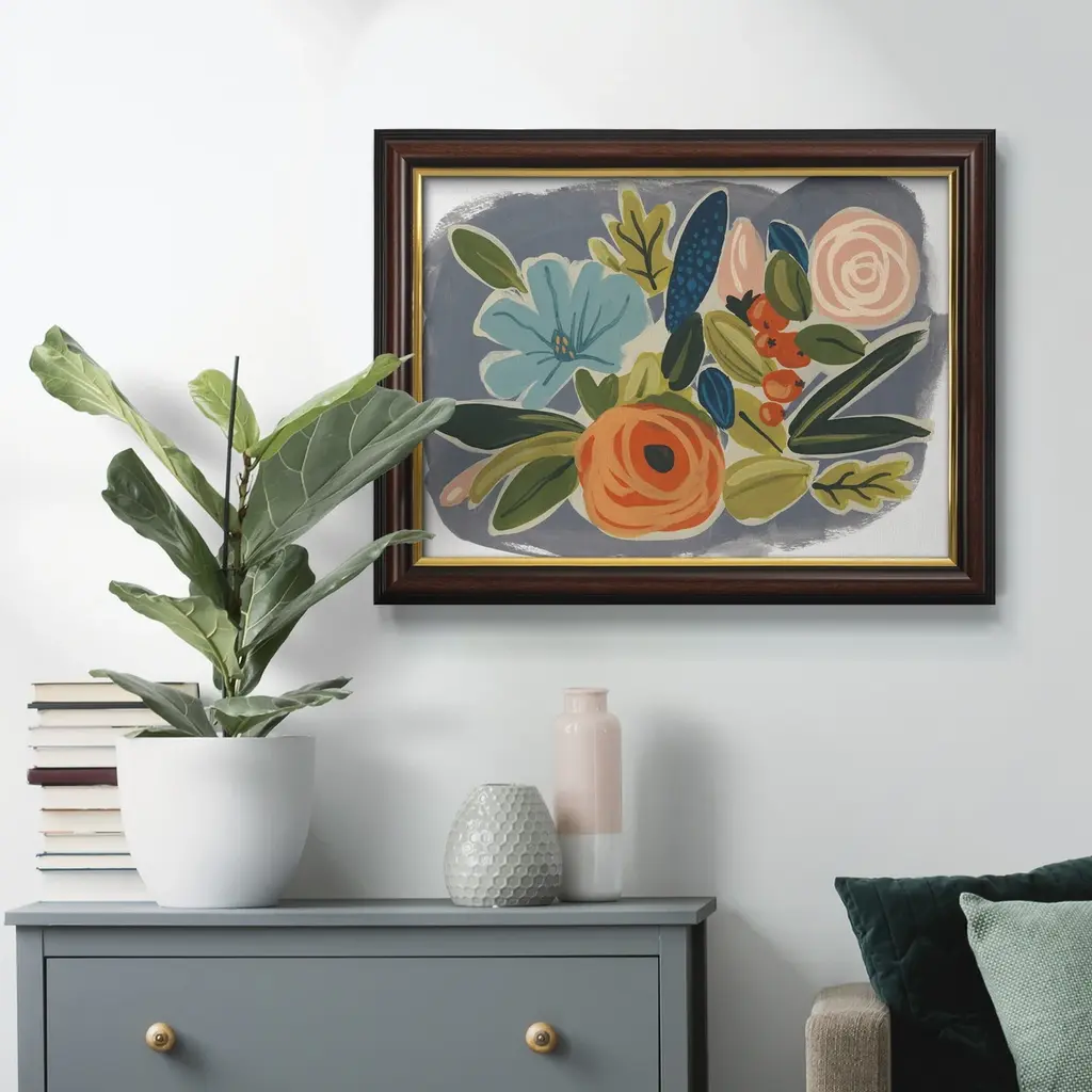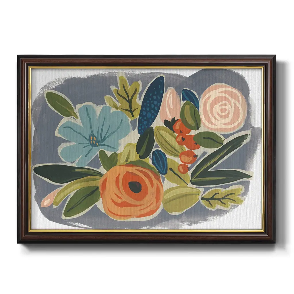 Bright Botany I Premium Framed Canvas- Ready to Hang A Premium Framed Canvas created to last. Framed in distressed wood and available in an array of sizes and colors Featuring a beveled a solid wood stretcher bar, each piece comes ready to hand 3 SIZES AVAILABLE 16''X20'' - Overall Size 18'X27'' - Overall Size 24''x36'' - Overall Size Each piece is made to order. Each piece comes with hanging hardware. Made in the USA Ready to Hang Giclee Paper Print Acrylic Glass Beveled Matt Board