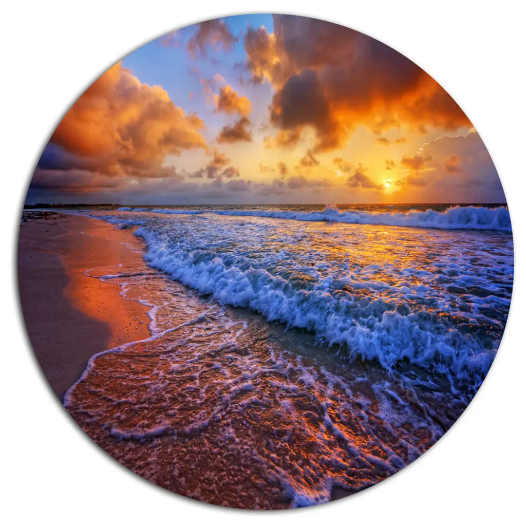 Bring Contemporary Abstraction to your home with this large Circle Metal wall art. This Bright Cloudy Sunset in Calm Ocean Metal Artwork makes it the focal point of any room or office. - White Gloss Coating ensures colors are extra vibrant with light reflection.- Aluminum grade Sheet Metal with 1 inch mounting frame on the back giving the illusion that the artwork is floating on the wall..- Mounting Brackets are included along with instructions.- High Quality Digital images are created directly into a glossy aluminum panel producing a stunning and captivating print into the glossy finish of the metal.- Water, Fire and Scratch resistant HD Aluminum panels.- Looks better than any photo paper and guaranteed to last at least 20 years- Easy to clean with a microfiber cloth. Colors are far superior to regular Canvas Art. - Easy to Hang