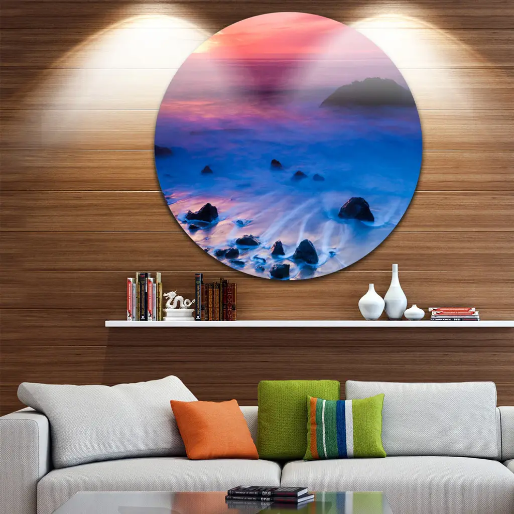 Bring Contemporary Abstraction to your home with this large Circle Metal wall art. This Bright Colorful Rocky Coast Panorama Metal Artwork makes it the focal point of any room or office. - White Gloss Coating ensures colors are extra vibrant with light reflection.- Aluminum grade Sheet Metal with 1 inch mounting frame on the back giving the illusion that the artwork is floating on the wall..- Mounting Brackets are included along with instructions.- High Quality Digital images are created directly into a glossy aluminum panel producing a stunning and captivating print into the glossy finish of the metal.- Water, Fire and Scratch resistant HD Aluminum panels.- Looks better than any photo paper and guaranteed to last at least 20 years- Easy to clean with a microfiber cloth. Colors are far superior to regular Canvas Art. - Easy to Hang