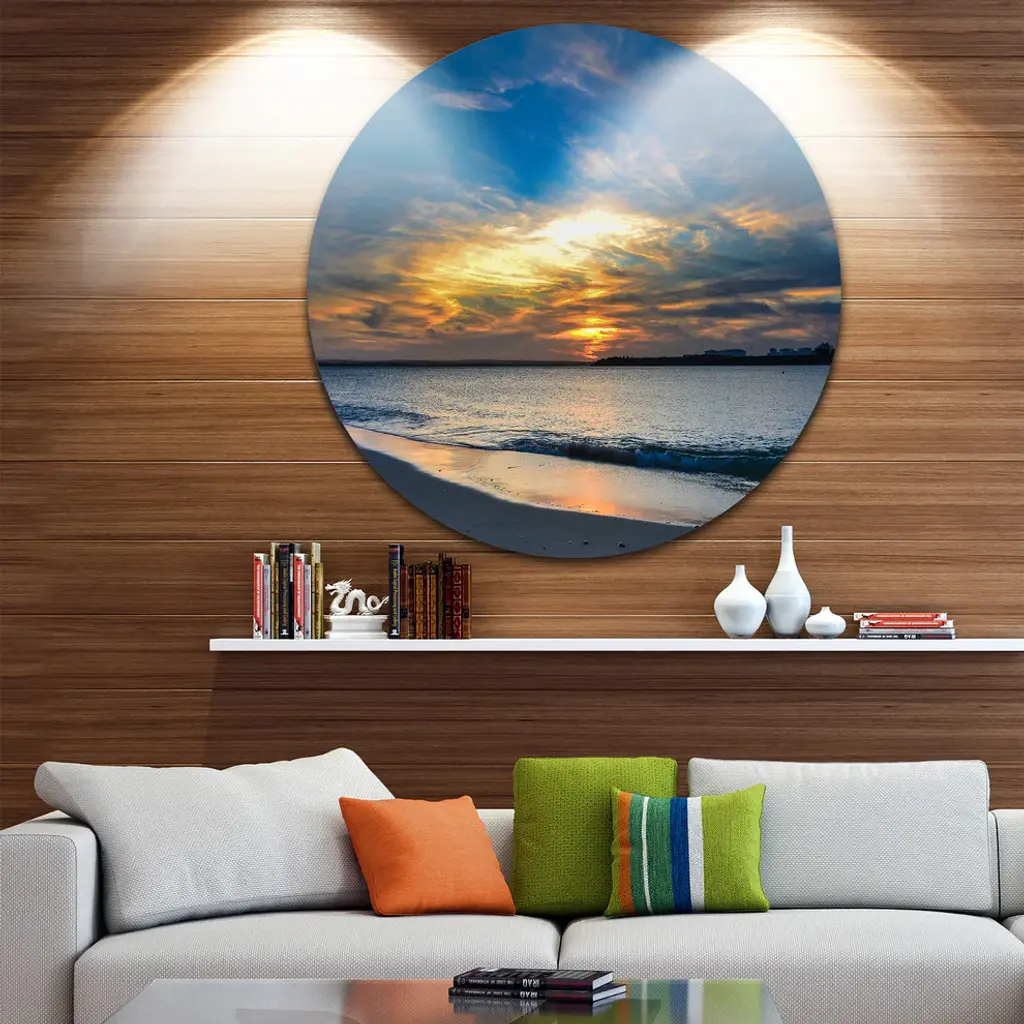 Bring Contemporary Abstraction to your home with this large Circle Metal wall art. This Bright Colorful Sydney Sky Over Beach Metal Artwork makes it the focal point of any room or office. - White Gloss Coating ensures colors are extra vibrant with light reflection.- Aluminum grade Sheet Metal with 1 inch mounting frame on the back giving the illusion that the artwork is floating on the wall..- Mounting Brackets are included along with instructions.- High Quality Digital images are created directly into a glossy aluminum panel producing a stunning and captivating print into the glossy finish of the metal.- Water, Fire and Scratch resistant HD Aluminum panels.- Looks better than any photo paper and guaranteed to last at least 20 years- Easy to clean with a microfiber cloth. Colors are far superior to regular Canvas Art. - Easy to Hang