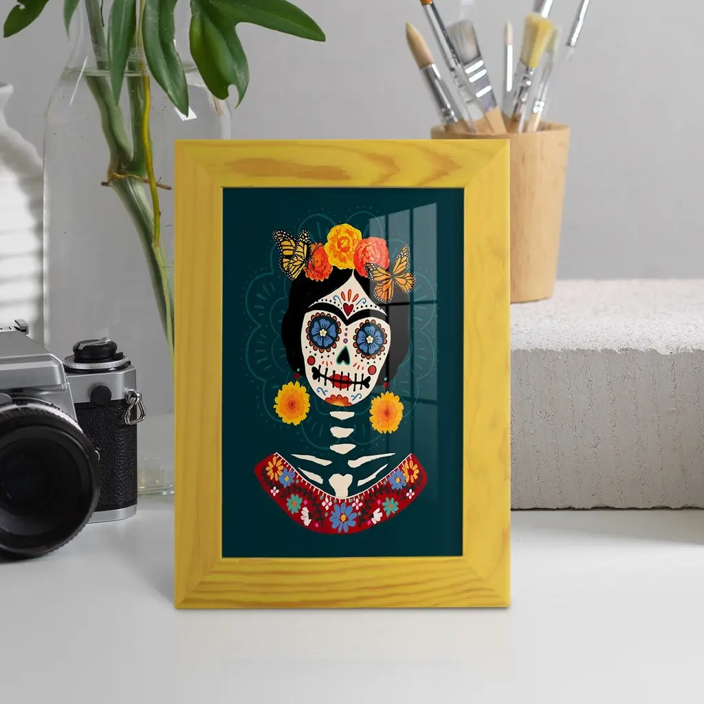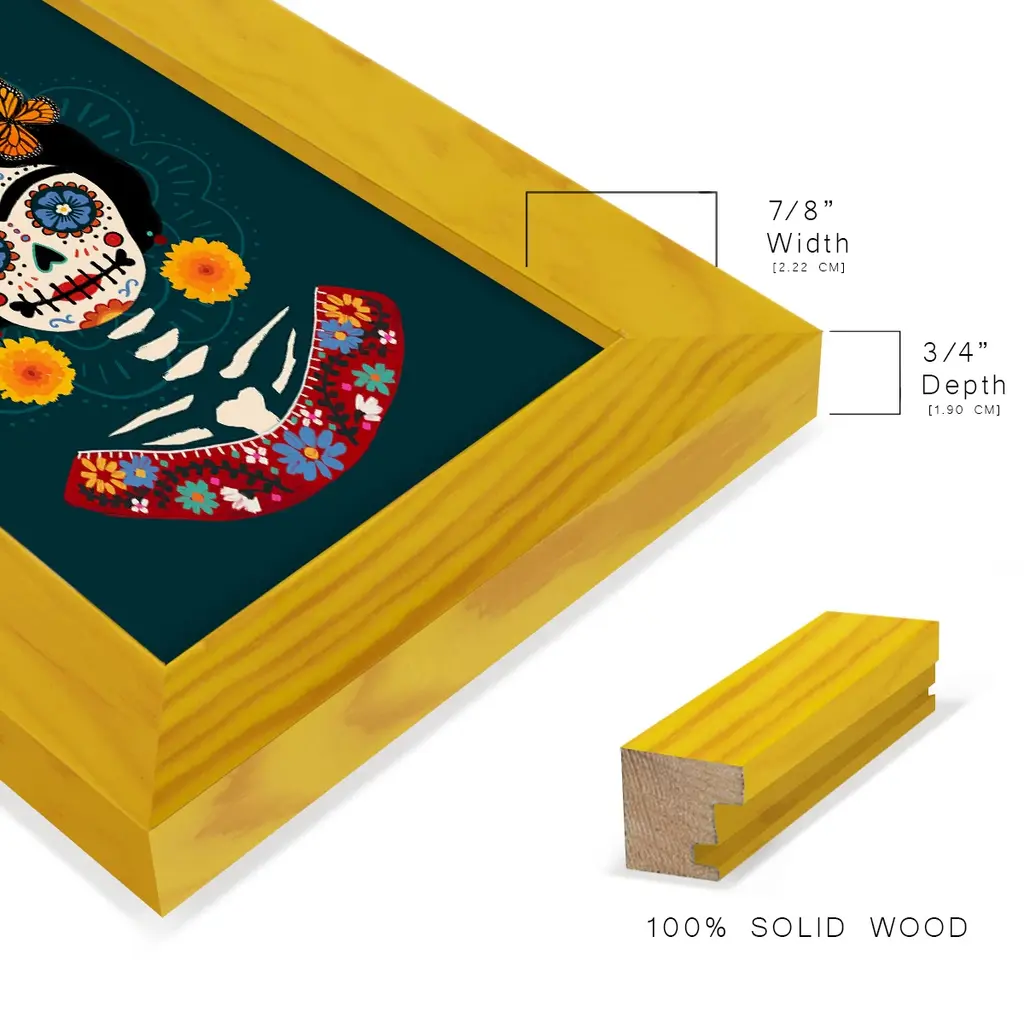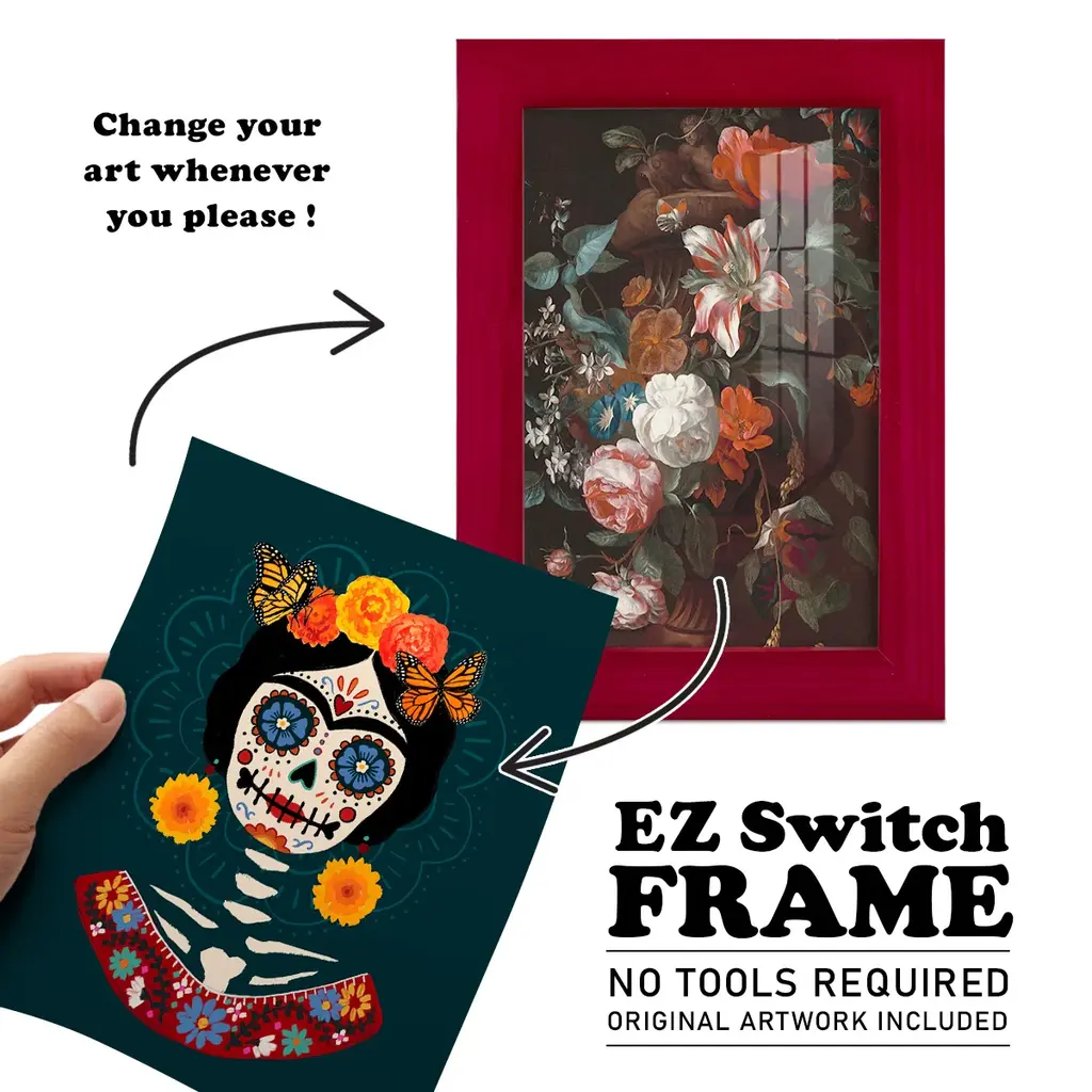 Bright Day of the Dead I -EZ SWITCH Framed Print w/glass-Cherry Red A delightful, framed print. Featuring a solid wood frame with real wood glass. This premium print is giclee quality. In addition, every frame features a removable back and table top stand. This allows you to change your art in the future or to just stand the art on a table for a new look. We are sure you'll enjoy our new series of EZ SWITCH Framed Art. Solid Wood Frame Real Glass Removable / Replaceable Art Built in Tabletop Stand Sizes range from 4x6 up to 12x15 - buy just one or pair them up as sets as you see fit.