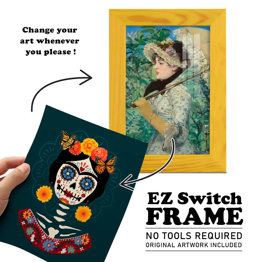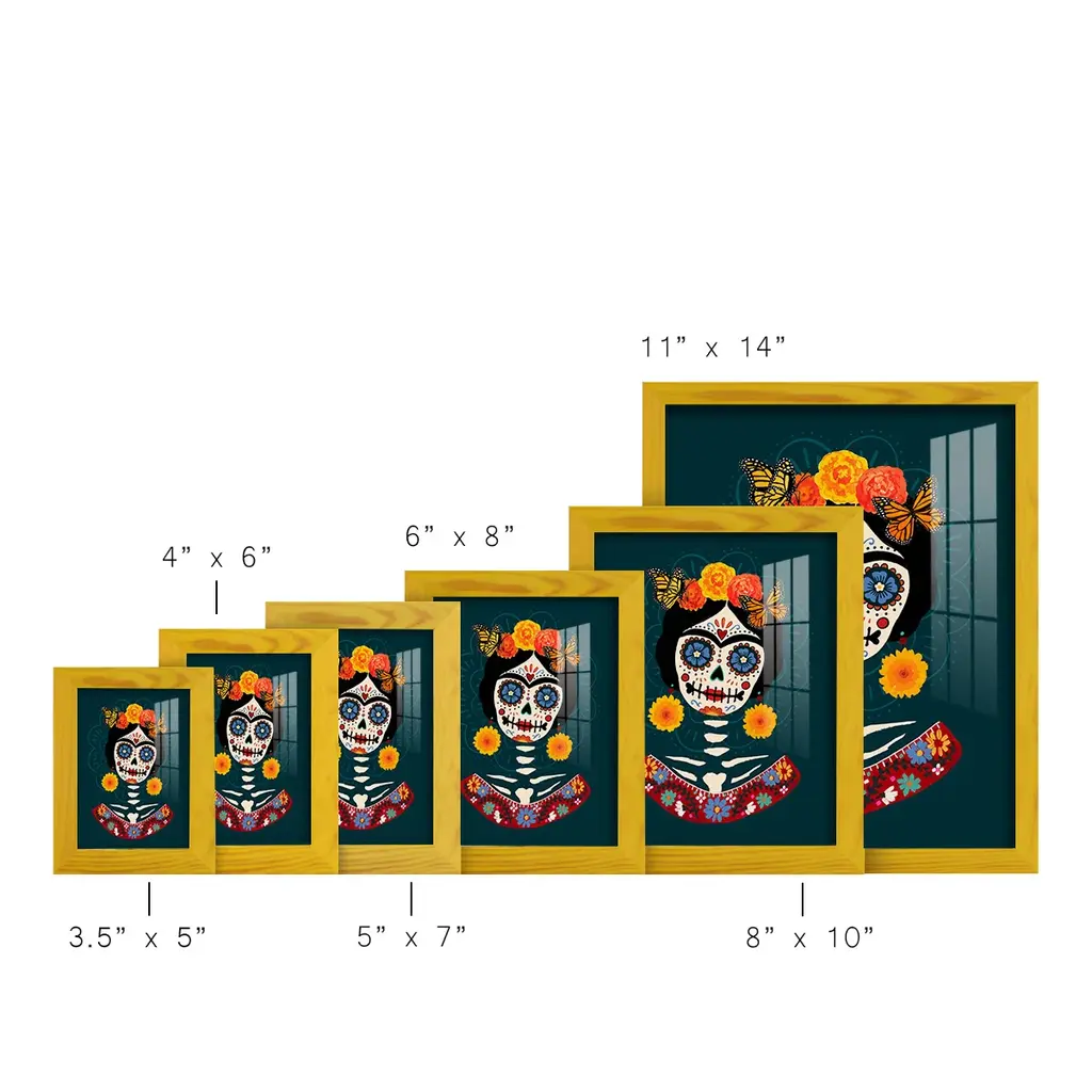 Bright Day of the Dead I -EZ SWITCH Framed Print w/glass-Cherry Red A delightful, framed print. Featuring a solid wood frame with real wood glass. This premium print is giclee quality. In addition, every frame features a removable back and table top stand. This allows you to change your art in the future or to just stand the art on a table for a new look. We are sure you'll enjoy our new series of EZ SWITCH Framed Art. Solid Wood Frame Real Glass Removable / Replaceable Art Built in Tabletop Stand Sizes range from 4x6 up to 12x15 - buy just one or pair them up as sets as you see fit.