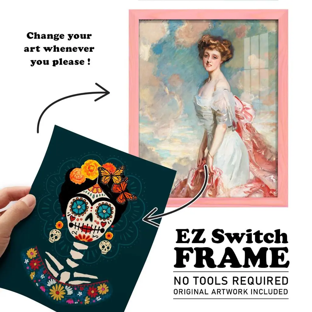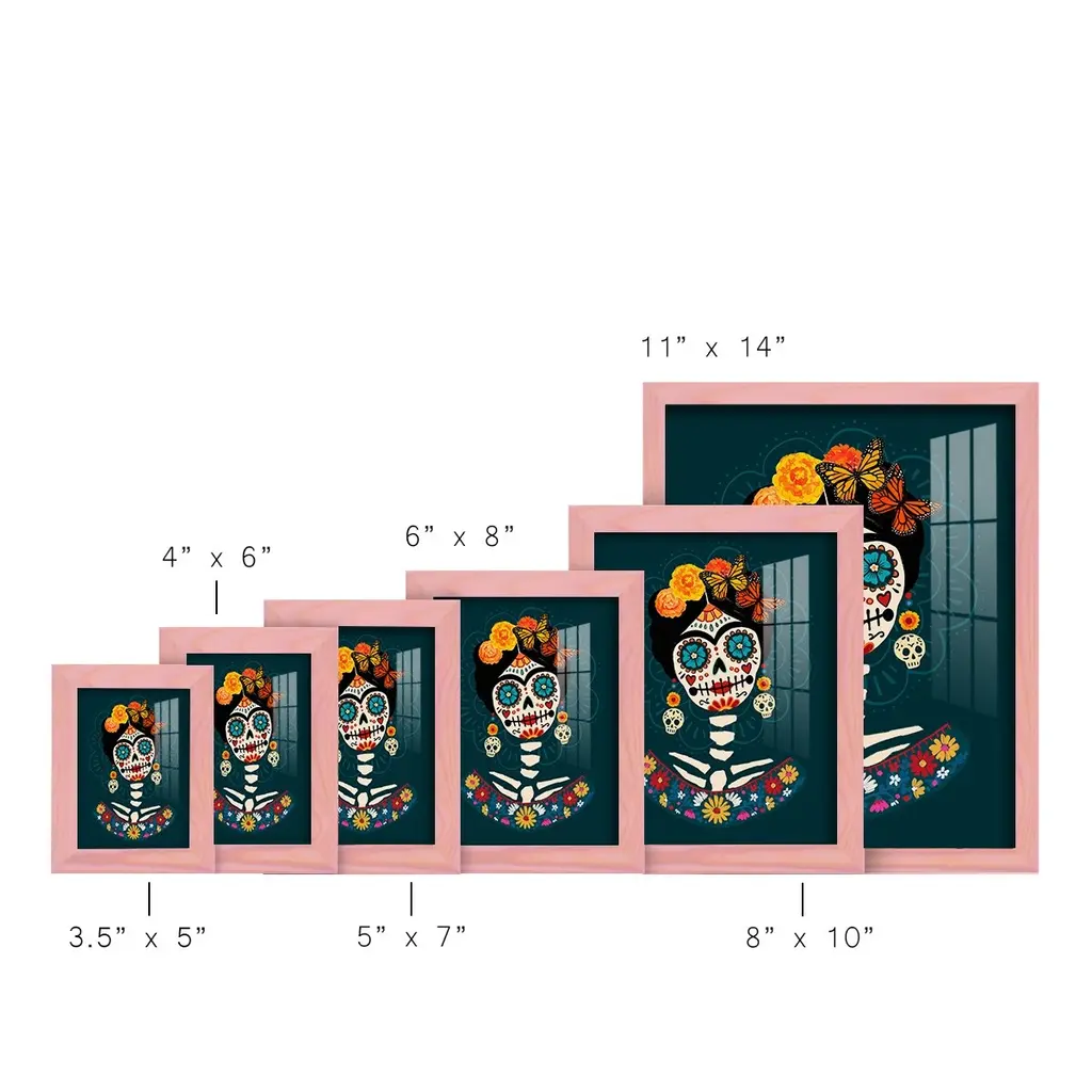 Bright Day of the Dead II -EZ SWITCH Framed Print w/glass-Cherry Red A delightful, framed print. Featuring a solid wood frame with real wood glass. This premium print is giclee quality. In addition, every frame features a removable back and table top stand. This allows you to change your art in the future or to just stand the art on a table for a new look. We are sure you'll enjoy our new series of EZ SWITCH Framed Art. Solid Wood Frame Real Glass Removable / Replaceable Art Built in Tabletop Stand Sizes range from 4x6 up to 12x15 - buy just one or pair them up as sets as you see fit.