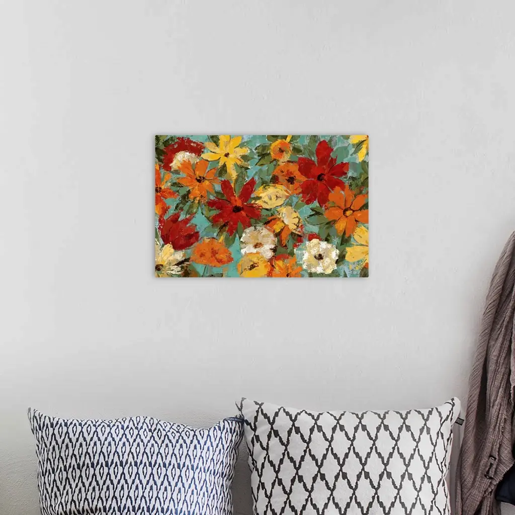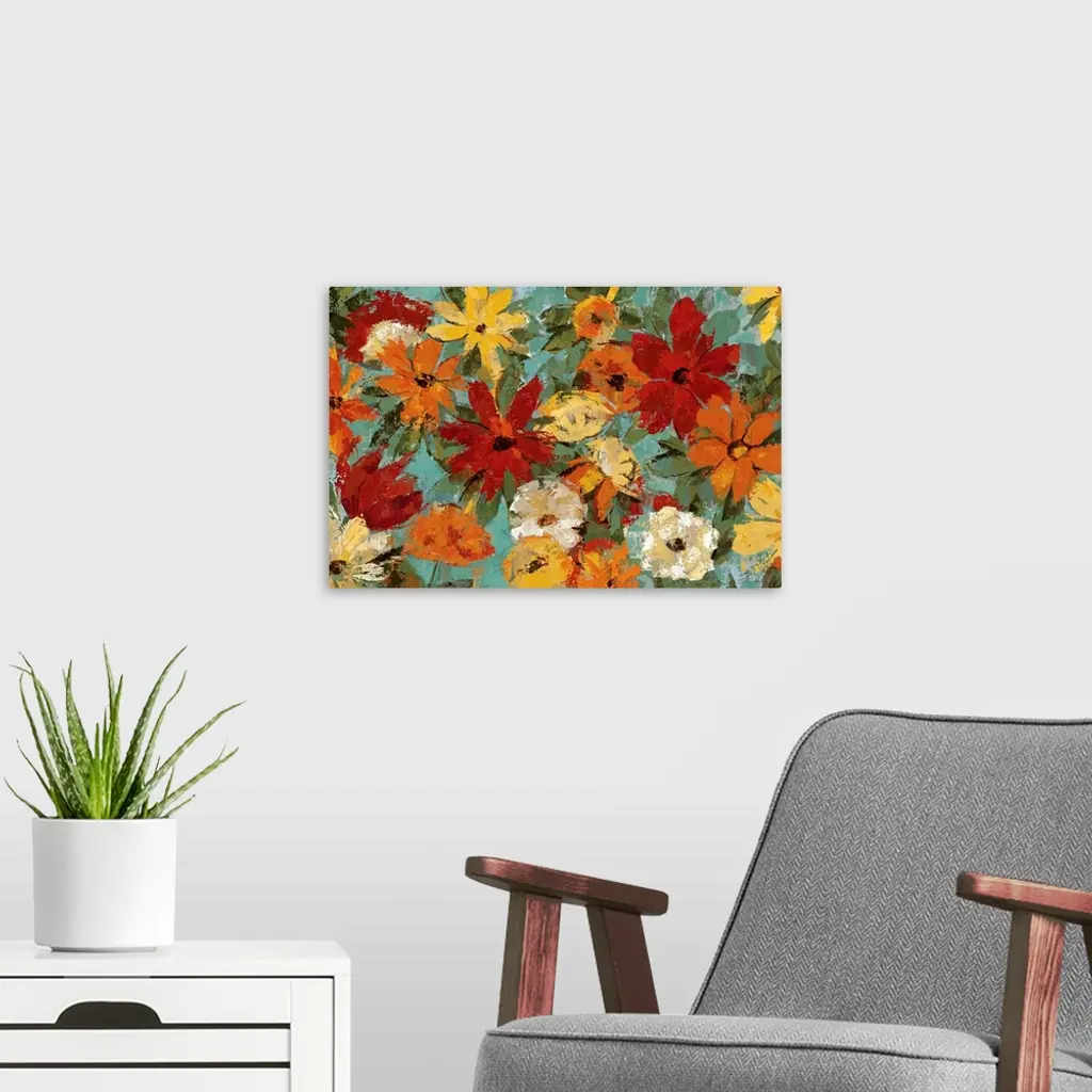 Decorative artwork perfect for the home of warm toned painted flowers against a greenish blue background.