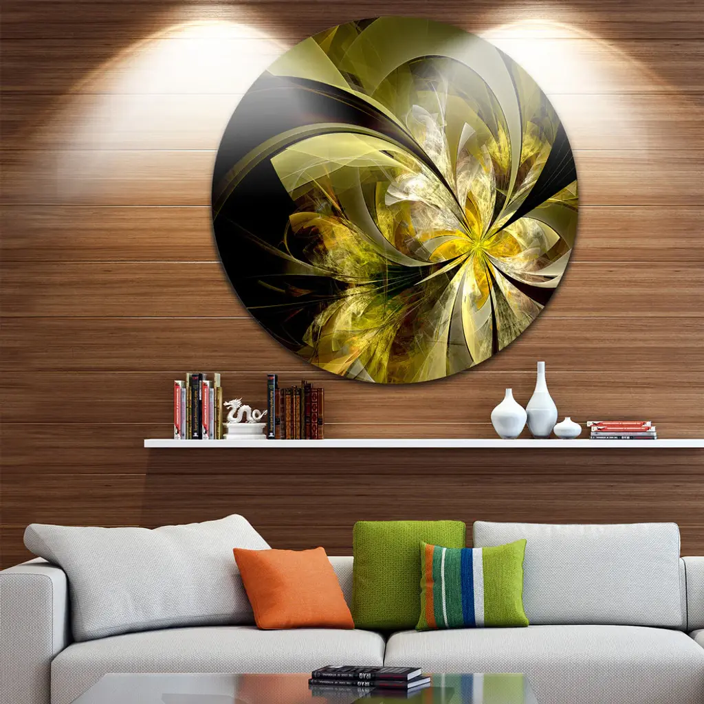 Bring Contemporary Abstraction to your home with this large Circle Metal wall art. This Bright Golden Fractal Flower Design Metal Artwork makes it the focal point of any room or office. - White Gloss Coating ensures colors are extra vibrant with light reflection.- Aluminum grade Sheet Metal with 1 inch mounting frame on the back giving the illusion that the artwork is floating on the wall..- Mounting Brackets are included along with instructions.- High Quality Digital images are created directly into a glossy aluminum panel producing a stunning and captivating print into the glossy finish of the metal.- Water, Fire and Scratch resistant HD Aluminum panels.- Looks better than any photo paper and guaranteed to last at least 20 years- Easy to clean with a microfiber cloth. Colors are far superior to regular Canvas Art. - Easy to Hang