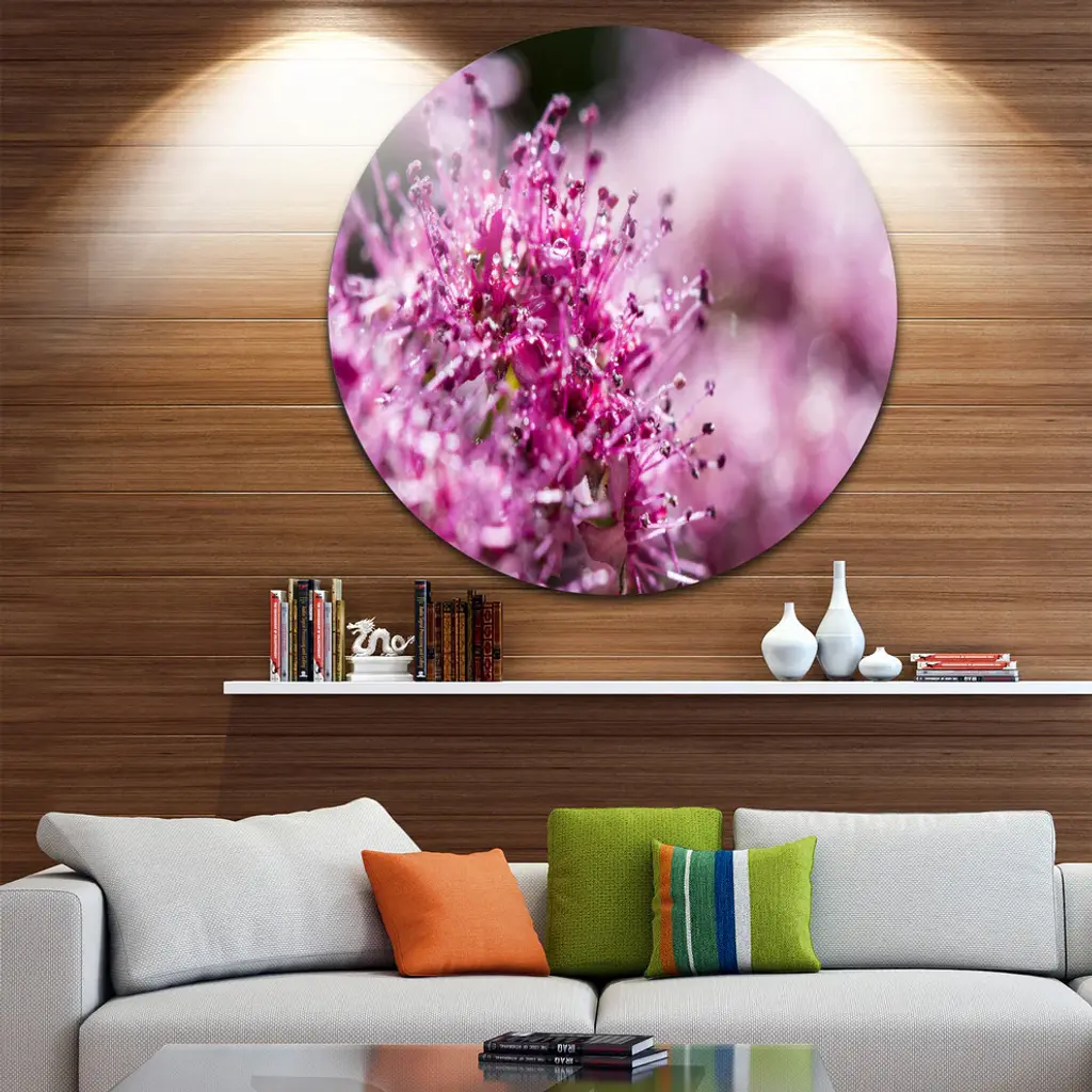 Bring Contemporary Abstraction to your home with this large Circle Metal wall art. This Bright Pink Little Flowers Metal Artwork makes it the focal point of any room or office. - White Gloss Coating ensures colors are extra vibrant with light reflection.- Aluminum grade Sheet Metal with 1 inch mounting frame on the back giving the illusion that the artwork is floating on the wall..- Mounting Brackets are included along with instructions.- High Quality Digital images are created directly into a glossy aluminum panel producing a stunning and captivating print into the glossy finish of the metal.- Water, Fire and Scratch resistant HD Aluminum panels.- Looks better than any photo paper and guaranteed to last at least 20 years- Easy to clean with a microfiber cloth. Colors are far superior to regular Canvas Art. - Easy to Hang