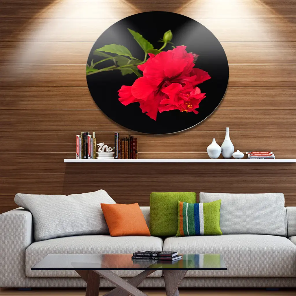 Bring Contemporary Abstraction to your home with this large Circle Metal wall art. This Bright Red Hibiscus on Black Metal Artwork makes it the focal point of any room or office. - White Gloss Coating ensures colors are extra vibrant with light reflection.- Aluminum grade Sheet Metal with 1 inch mounting frame on the back giving the illusion that the artwork is floating on the wall..- Mounting Brackets are included along with instructions.- High Quality Digital images are created directly into a glossy aluminum panel producing a stunning and captivating print into the glossy finish of the metal.- Water, Fire and Scratch resistant HD Aluminum panels.- Looks better than any photo paper and guaranteed to last at least 20 years- Easy to clean with a microfiber cloth. Colors are far superior to regular Canvas Art. - Easy to Hang