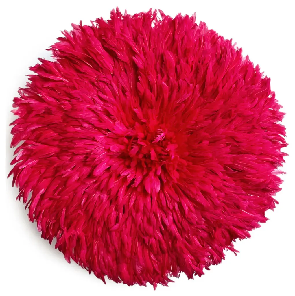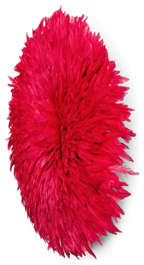 Beautiful hand crafted original JuJu hat wall art. Vibrant red feathers. These attractive bird feather art form were originally worn as a headdress by dignitaries, chiefs, and the royal families also wear these ceremonial hats as a symbol of prosperity and wealth. Created from woven natural or brightly colored dyed wild chicken feathers then tied to straps and pulled open into a stunning circular display.