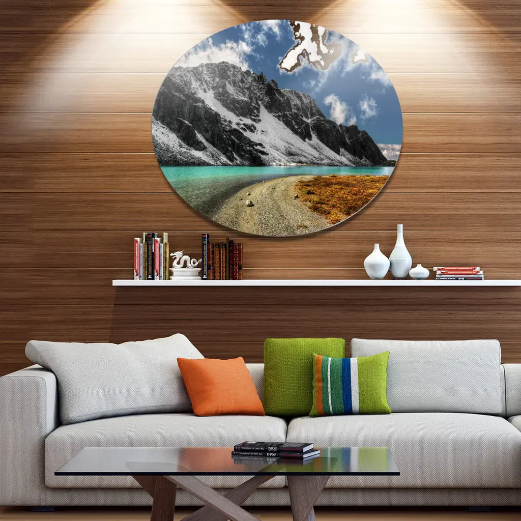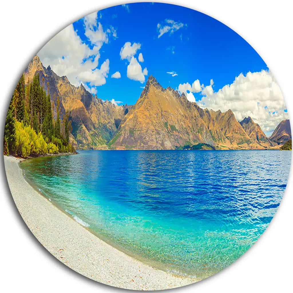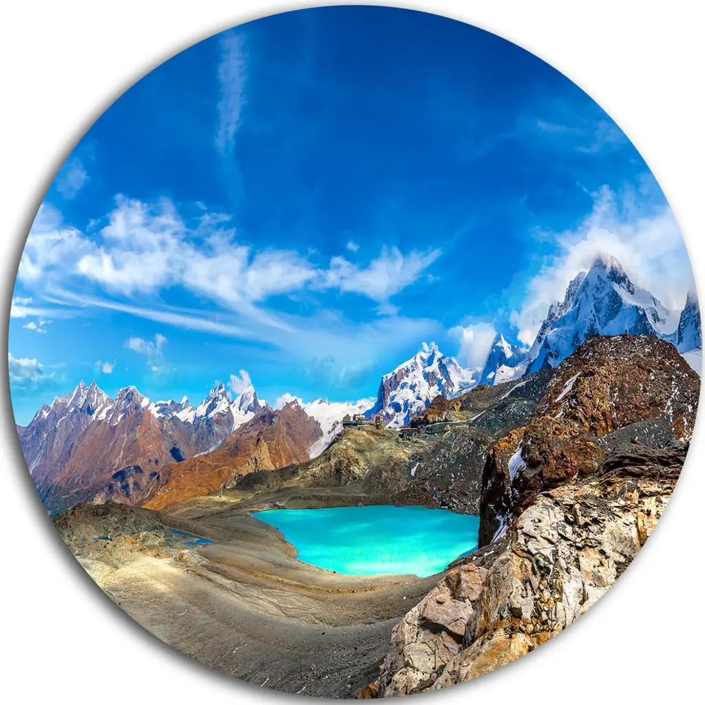 Bring Contemporary Abstraction to your home with this large Circle Metal wall art. This Bright Sky and Blue Mountain Lake Metal Artwork makes it the focal point of any room or office. - White Gloss Coating ensures colors are extra vibrant with light reflection.- Aluminum grade Sheet Metal with 1 inch mounting frame on the back giving the illusion that the artwork is floating on the wall..- Mounting Brackets are included along with instructions.- High Quality Digital images are created directly into a glossy aluminum panel producing a stunning and captivating print into the glossy finish of the metal.- Water, Fire and Scratch resistant HD Aluminum panels.- Looks better than any photo paper and guaranteed to last at least 20 years- Easy to clean with a microfiber cloth. Colors are far superior to regular Canvas Art. - Easy to Hang