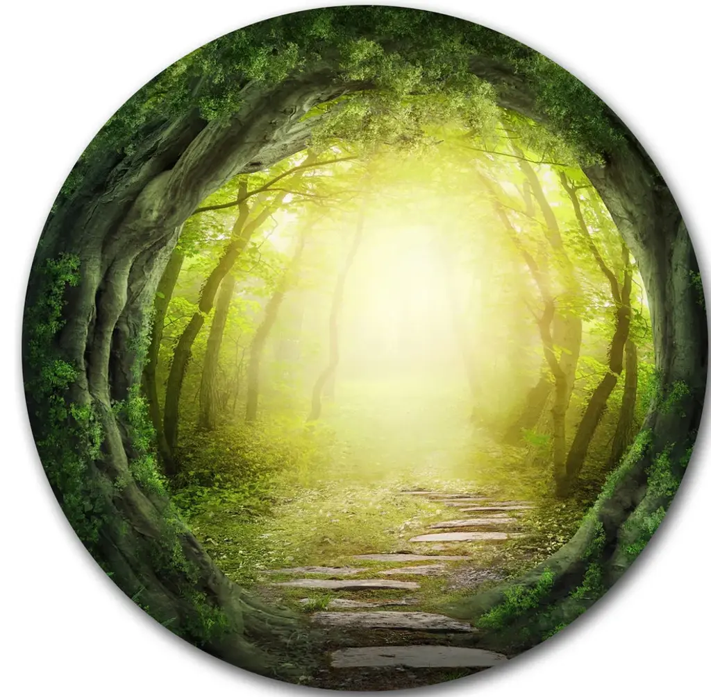 Bring Contemporary Abstraction to your home with this large Circle Metal wall art. This Bright Sun in Mystical Park Metal Artwork makes it the focal point of any room or office. - White Gloss Coating ensures colors are extra vibrant with light reflection.- Aluminum grade Sheet Metal with 1 inch mounting frame on the back giving the illusion that the artwork is floating on the wall..- Mounting Brackets are included along with instructions.- High Quality Digital images are created directly into a glossy aluminum panel producing a stunning and captivating print into the glossy finish of the metal.- Water, Fire and Scratch resistant HD Aluminum panels.- Looks better than any photo paper and guaranteed to last at least 20 years- Easy to clean with a microfiber cloth. Colors are far superior to regular Canvas Art. - Easy to Hang