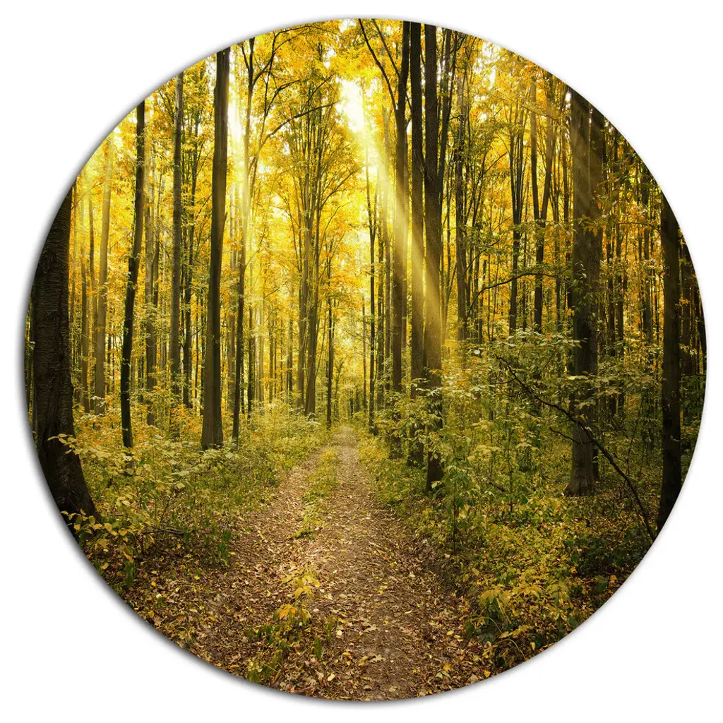 Bring Contemporary Abstraction to your home with this large Circle Metal wall art. This Bright Sunlight in Yellow Fall Forest Metal Artwork makes it the focal point of any room or office. - White Gloss Coating ensures colors are extra vibrant with light reflection.- Aluminum grade Sheet Metal with 1 inch mounting frame on the back giving the illusion that the artwork is floating on the wall..- Mounting Brackets are included along with instructions.- High Quality Digital images are created directly into a glossy aluminum panel producing a stunning and captivating print into the glossy finish of the metal.- Water, Fire and Scratch resistant HD Aluminum panels.- Looks better than any photo paper and guaranteed to last at least 20 years- Easy to clean with a microfiber cloth. Colors are far superior to regular Canvas Art. - Easy to Hang