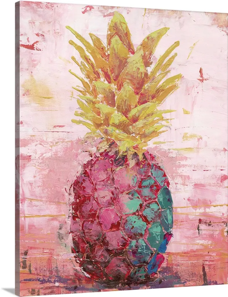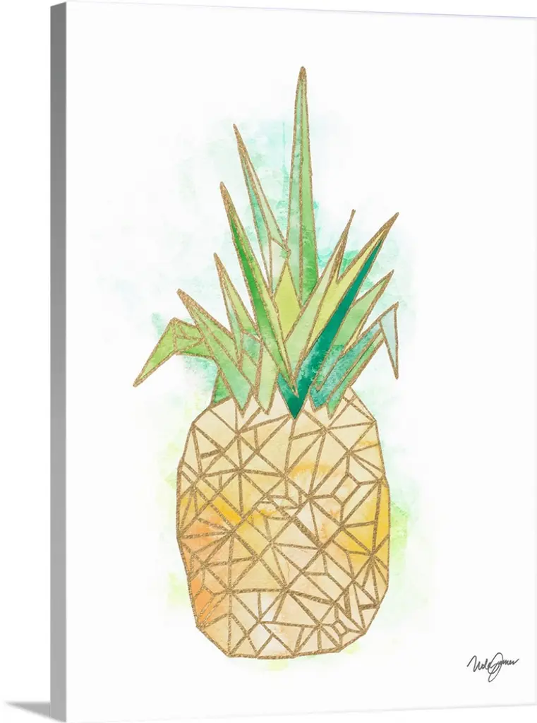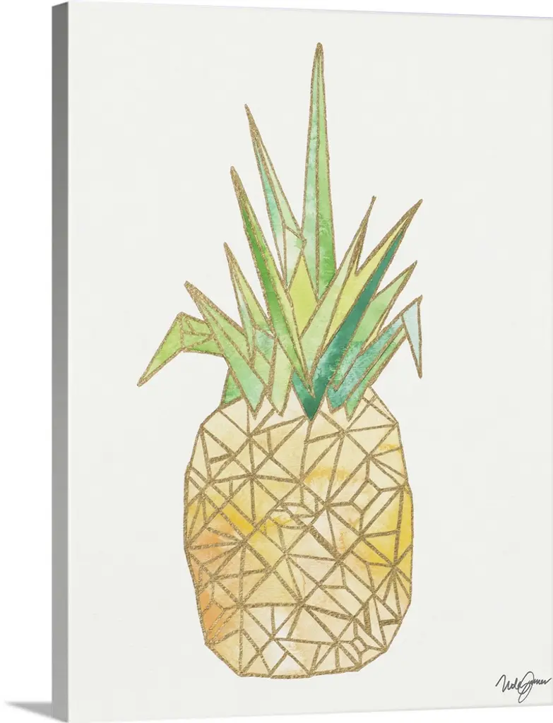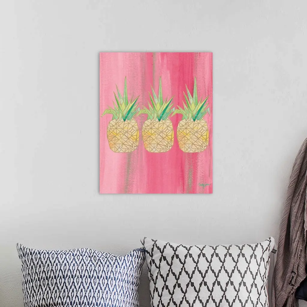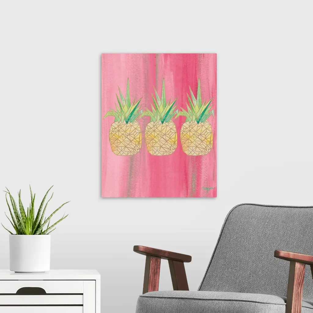 Painting of three pineapples created with metallic gold geometric shapes on a pink background.
