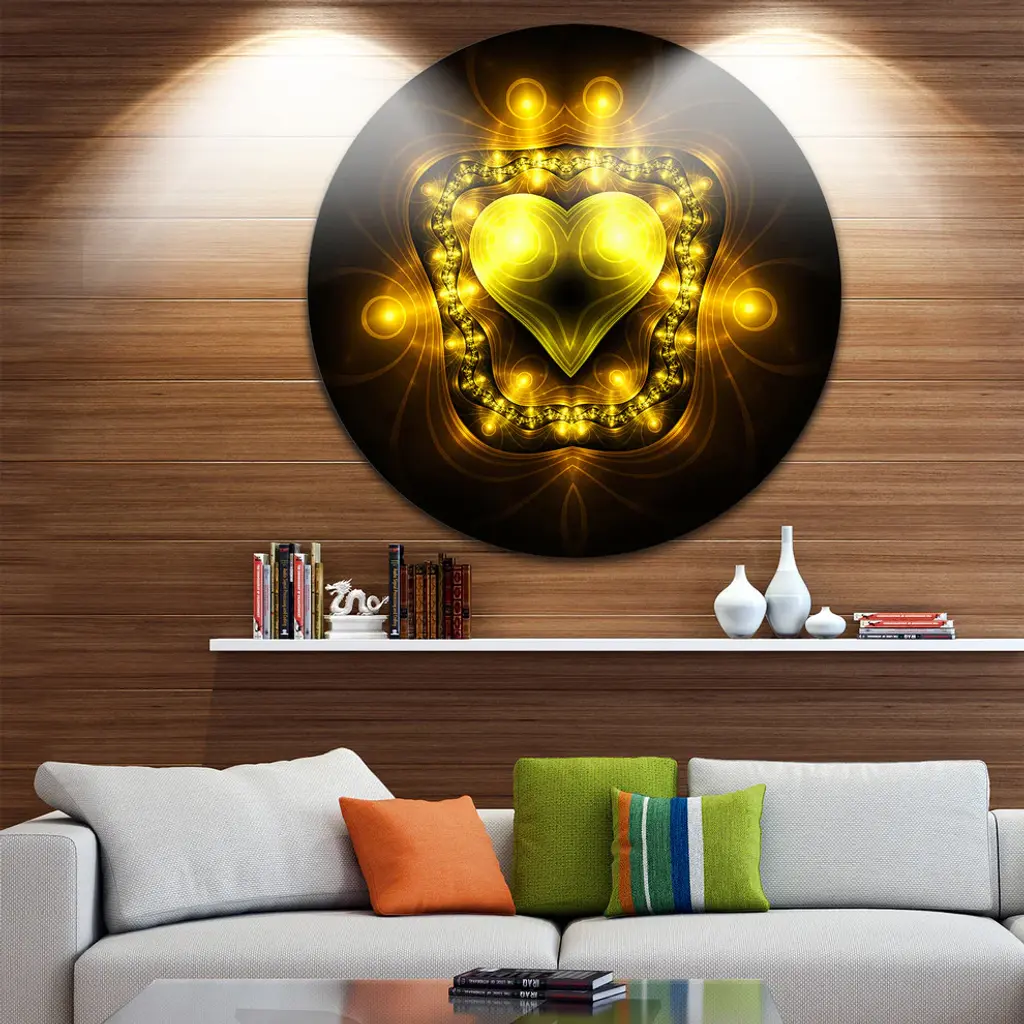 Bring Contemporary Abstraction to your home with this large Circle Metal wall art. This Bright Yellow in Black Fractal Flower Metal Artwork makes it the focal point of any room or office. - White Gloss Coating ensures colors are extra vibrant with light reflection.- Aluminum grade Sheet Metal with 1 inch mounting frame on the back giving the illusion that the artwork is floating on the wall..- Mounting Brackets are included along with instructions.- High Quality Digital images are created directly into a glossy aluminum panel producing a stunning and captivating print into the glossy finish of the metal.- Water, Fire and Scratch resistant HD Aluminum panels.- Looks better than any photo paper and guaranteed to last at least 20 years- Easy to clean with a microfiber cloth. Colors are far superior to regular Canvas Art. - Easy to Hang