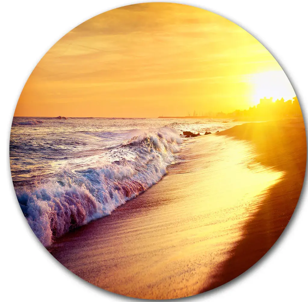 Bring Contemporary Abstraction to your home with this large Circle Metal wall art. This Bright Yellow Sky with Foam Waves Metal Artwork makes it the focal point of any room or office. - White Gloss Coating ensures colors are extra vibrant with light reflection.- Aluminum grade Sheet Metal with 1 inch mounting frame on the back giving the illusion that the artwork is floating on the wall..- Mounting Brackets are included along with instructions.- High Quality Digital images are created directly into a glossy aluminum panel producing a stunning and captivating print into the glossy finish of the metal.- Water, Fire and Scratch resistant HD Aluminum panels.- Looks better than any photo paper and guaranteed to last at least 20 years- Easy to clean with a microfiber cloth. Colors are far superior to regular Canvas Art. - Easy to Hang