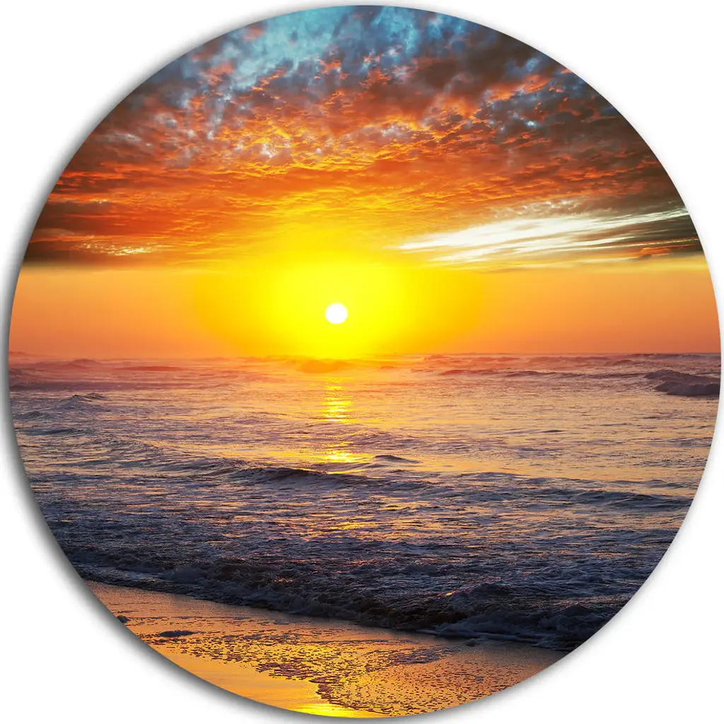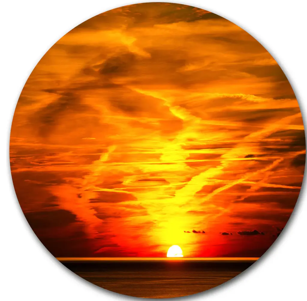 Bring Contemporary Abstraction to your home with this large Circle Metal wall art. This Bright Yellow Sunset Over Lake Metal Artwork makes it the focal point of any room or office. - White Gloss Coating ensures colors are extra vibrant with light reflection.- Aluminum grade Sheet Metal with 1 inch mounting frame on the back giving the illusion that the artwork is floating on the wall..- Mounting Brackets are included along with instructions.- High Quality Digital images are created directly into a glossy aluminum panel producing a stunning and captivating print into the glossy finish of the metal.- Water, Fire and Scratch resistant HD Aluminum panels.- Looks better than any photo paper and guaranteed to last at least 20 years- Easy to clean with a microfiber cloth. Colors are far superior to regular Canvas Art. - Easy to Hang