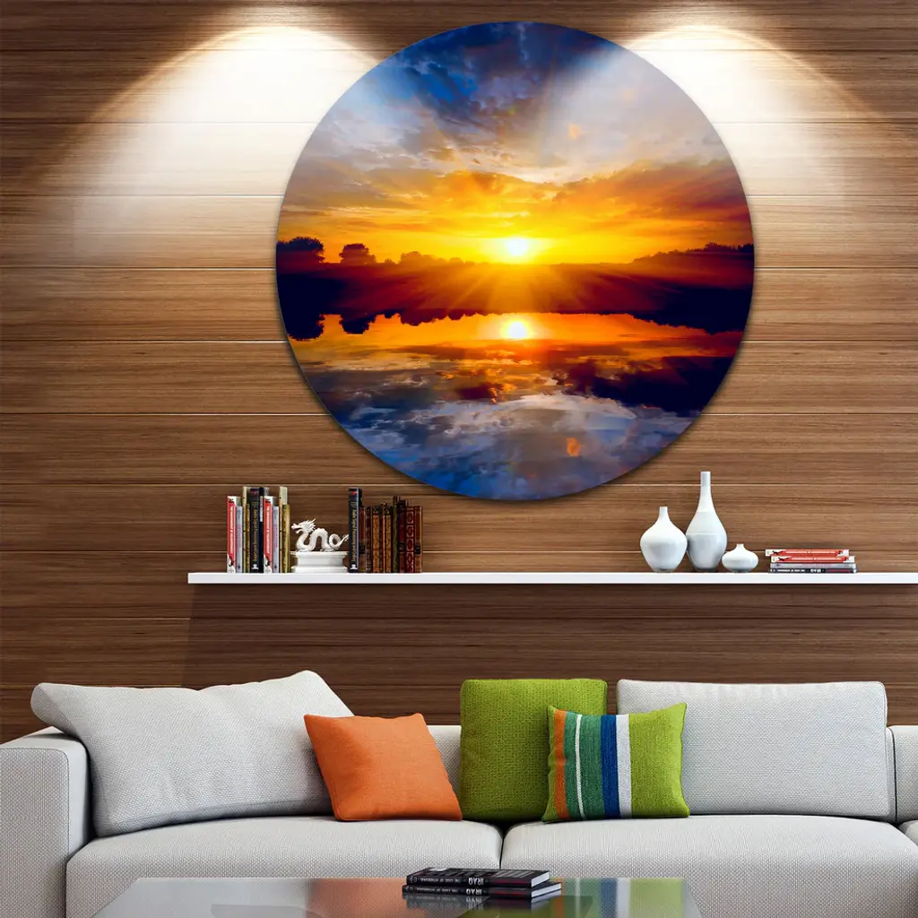 Bring Contemporary Abstraction to your home with this large Circle Metal wall art. This Bright Yellow Sunset Over Lake Metal Artwork makes it the focal point of any room or office. - White Gloss Coating ensures colors are extra vibrant with light reflection.- Aluminum grade Sheet Metal with 1 inch mounting frame on the back giving the illusion that the artwork is floating on the wall..- Mounting Brackets are included along with instructions.- High Quality Digital images are created directly into a glossy aluminum panel producing a stunning and captivating print into the glossy finish of the metal.- Water, Fire and Scratch resistant HD Aluminum panels.- Looks better than any photo paper and guaranteed to last at least 20 years- Easy to clean with a microfiber cloth. Colors are far superior to regular Canvas Art. - Easy to Hang