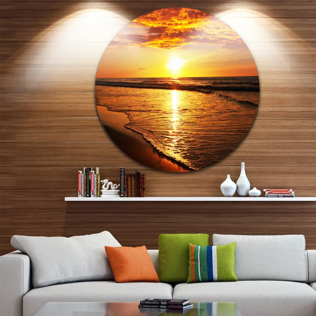 Bring Contemporary Abstraction to your home with this large Circle Metal wall art. This Bright Yellow Sunset over Waves Metal Artwork makes it the focal point of any room or office. - White Gloss Coating ensures colors are extra vibrant with light reflection.- Aluminum grade Sheet Metal with 1 inch mounting frame on the back giving the illusion that the artwork is floating on the wall..- Mounting Brackets are included along with instructions.- High Quality Digital images are created directly into a glossy aluminum panel producing a stunning and captivating print into the glossy finish of the metal.- Water, Fire and Scratch resistant HD Aluminum panels.- Looks better than any photo paper and guaranteed to last at least 20 years- Easy to clean with a microfiber cloth. Colors are far superior to regular Canvas Art. - Easy to Hang