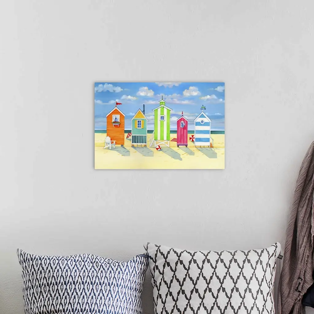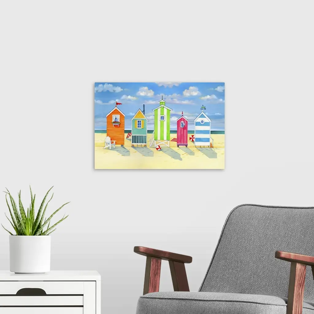 Contemporary painting of a row of colorful changing huts on Brighton beach.