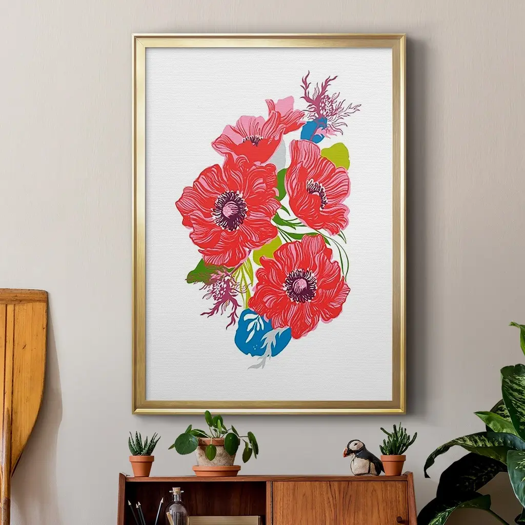 Brilliant Poppies I Premium Framed Print - Ready to Hang A Premium Framed Print created to last. Framed in distressed wood and available in an array of sizes and colors Featuring a beveled a solid wood stretcher bar, each piece comes ready to hand 4 SIZES AVAILABLE 30.5''X42.5'' - Overall Size 26.5'X36.5'' - Overall Size 22.5''x30.5'' - Overall Size 18.5''x24.5'' - Overall Size Each piece is made to order. Each piece comes with hanging hardware. Made in the USA Ready to Hang