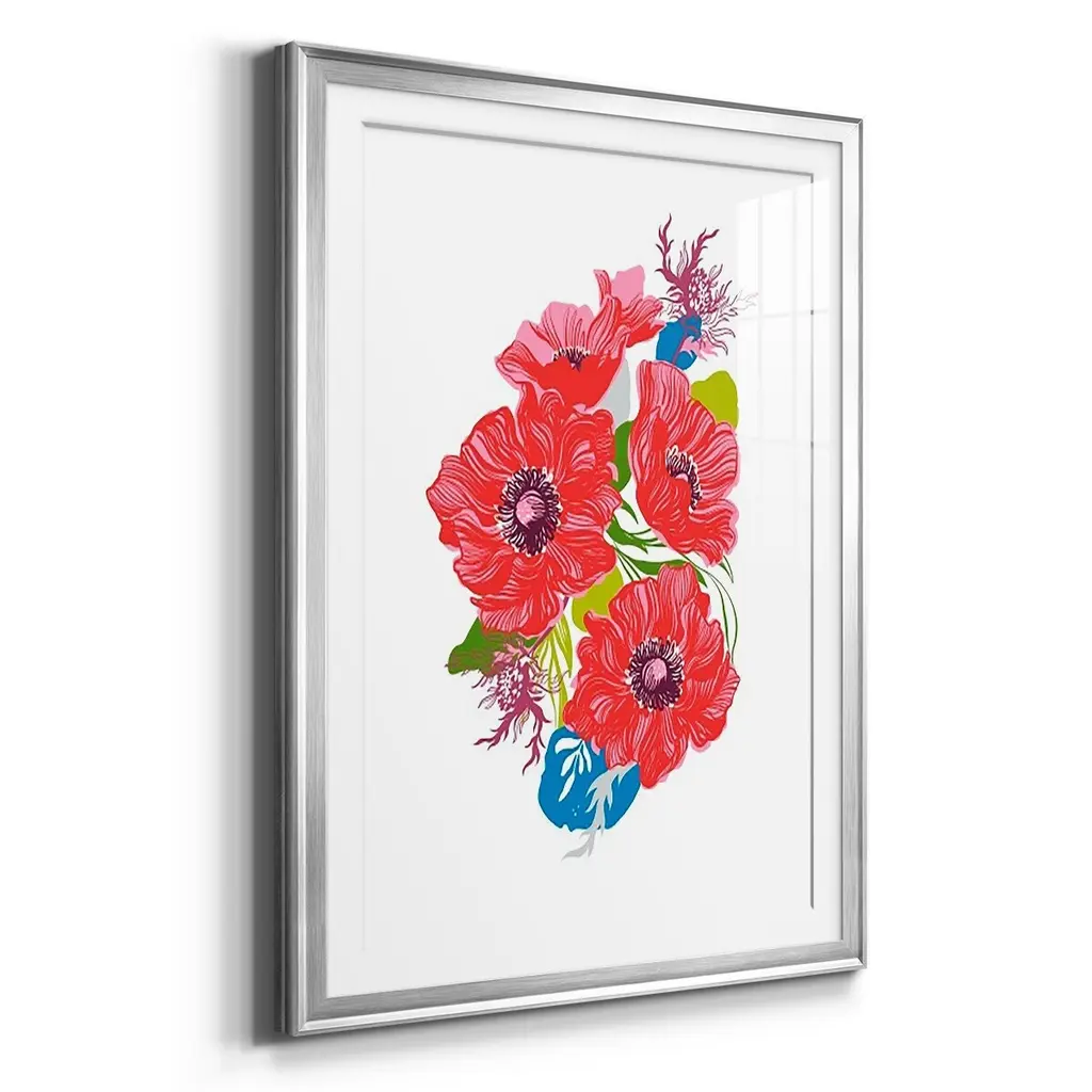 Brilliant Poppies I Premium Framed Print - Ready to Hang A Premium Framed Print created to last. Framed in distressed wood and available in an array of sizes and colors Featuring a beveled a solid wood stretcher bar, each piece comes ready to hand 4 SIZES AVAILABLE 30.5''X42.5'' - Overall Size 26.5'X36.5'' - Overall Size 22.5''x30.5'' - Overall Size 18.5''x24.5'' - Overall Size Each piece is made to order. Each piece comes with hanging hardware. Made in the USA Ready to Hang Giclee Paper Print Acrylic Glass Beveled Matt Board