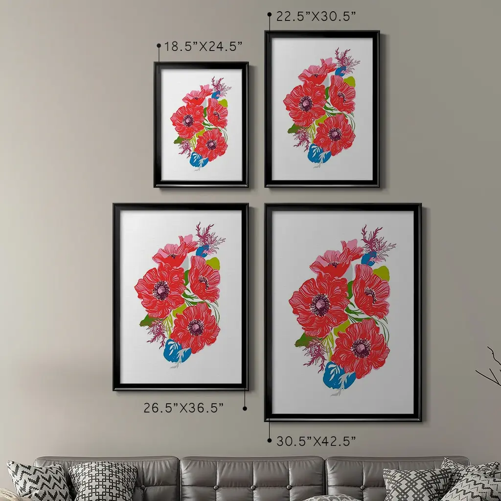 Brilliant Poppies I Premium Framed Print - Ready to Hang A Premium Framed Print created to last. Framed in distressed wood and available in an array of sizes and colors Featuring a beveled a solid wood stretcher bar, each piece comes ready to hand 4 SIZES AVAILABLE 30.5''X42.5'' - Overall Size 26.5'X36.5'' - Overall Size 22.5''x30.5'' - Overall Size 18.5''x24.5'' - Overall Size Each piece is made to order. Each piece comes with hanging hardware. Made in the USA Ready to Hang