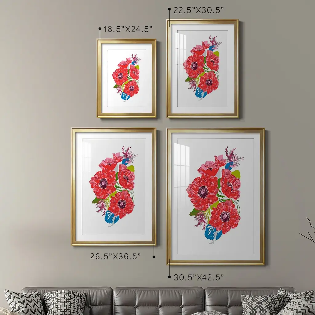 Brilliant Poppies I Premium Framed Print - Ready to Hang A Premium Framed Print created to last. Framed in distressed wood and available in an array of sizes and colors Featuring a beveled a solid wood stretcher bar, each piece comes ready to hand 4 SIZES AVAILABLE 30.5''X42.5'' - Overall Size 26.5'X36.5'' - Overall Size 22.5''x30.5'' - Overall Size 18.5''x24.5'' - Overall Size Each piece is made to order. Each piece comes with hanging hardware. Made in the USA Ready to Hang Giclee Paper Print Acrylic Glass Beveled Matt Board