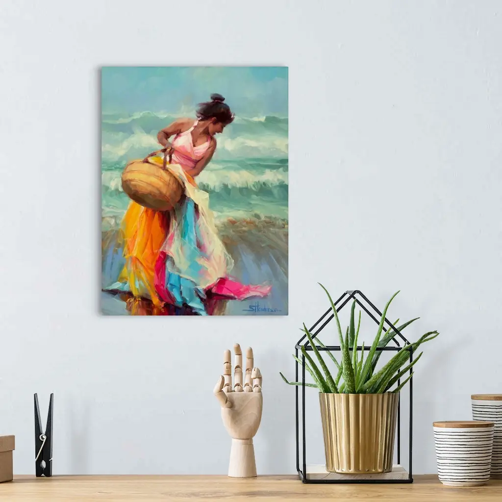 Traditional impressionist painting of a beautiful,laughing Hispanic woman holding a basket of overflowing colorful fabric, by the ocean seashore.